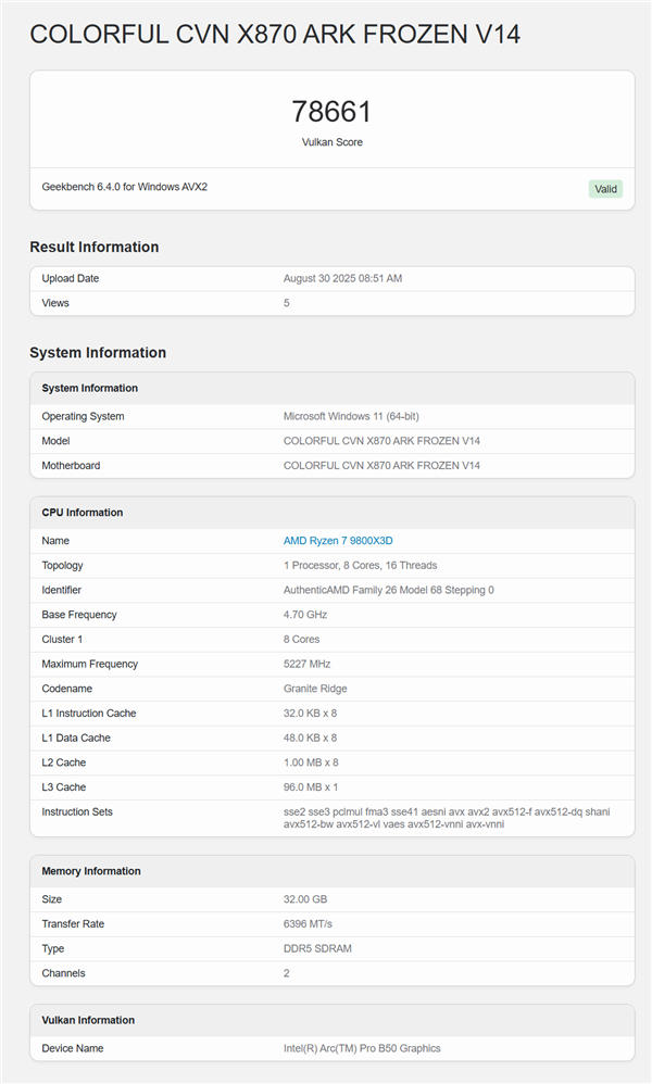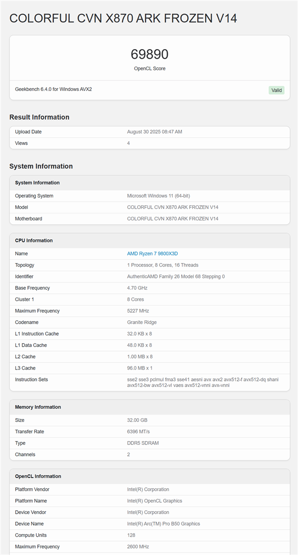 根据Geekbench测试数据显示,锐炫Pro B50在Vulkan测试中取得了78661分的成绩,而OpenCL测试得分则为69890分。