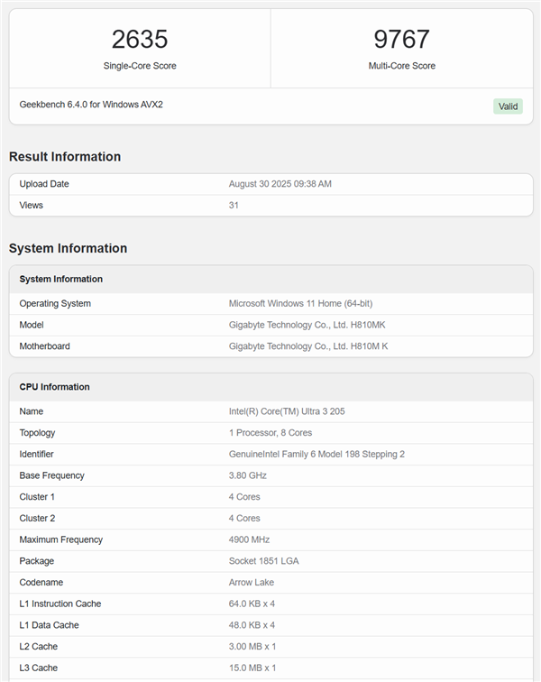 GeekBench 6测试数据库中首次出现了酷睿Ultra 3 205的身影。数据显示,这款处理器仍然采用性能核与能效核的混合架构设计,具体为4个性能核加4个能效核,总共形成8核心8线程的配置。