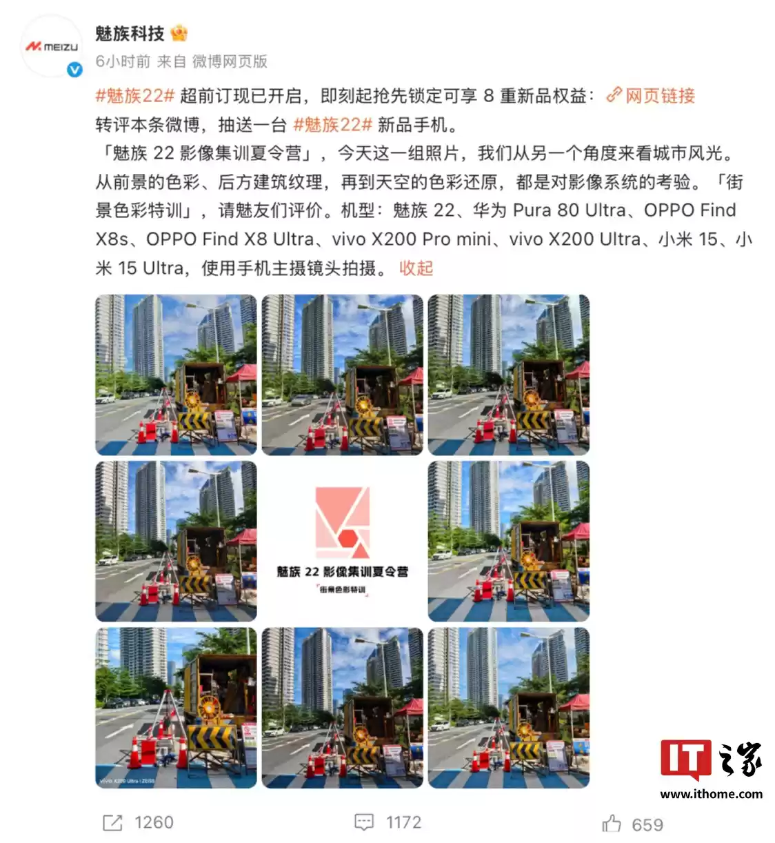 此外,目前魅族科技每日都在发布「魅族 22 影像集训夏令营」活动拍摄的样张。官方今日分享的是「街景色彩特训」拍摄场景,此次作陪的机型包括 vivo X200 Pro mini、vivo X200 Ultra、华为 Pura80 Ultra、OPPO Find X8s、OPPO Find X8 Ultra、小米 15、小米 15 Ultra。