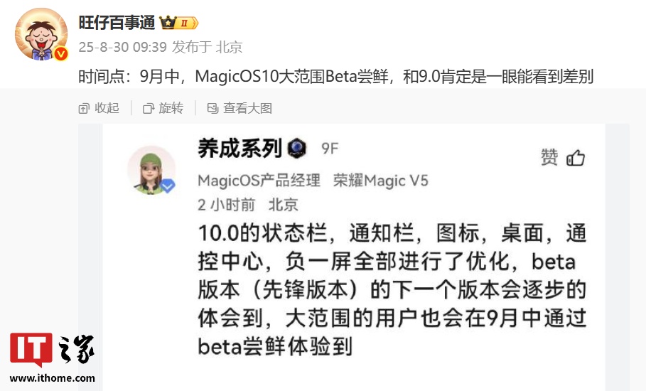 据博主 @旺仔百事通 昨日分享,荣耀 MagicOS 产品经理 @养成系列 在荣耀俱乐部回帖时透露,MagicOS 10.0 系统计划 9 月中旬开启大范围用户 Beta 尝鲜升级。