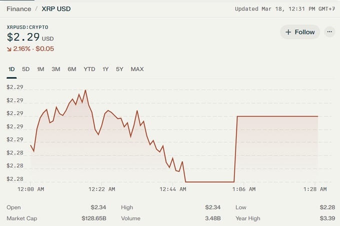 截至2025年3月18日,XRP现报2.29美元,24小时跌幅2.16%,较前收盘价2.34美元下跌0.05美元。盘中价格维持在2.28-2.34美元区间窄幅波动。当前XRP市值维持在1286.5亿美元,24小时交易量达34.8亿美元,显示出良好的市场流动性和持续的投资者参与度。