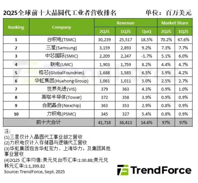 2025年Q2晶圆代工营收暴涨14.6%创新高,台积电独占70%市场份额