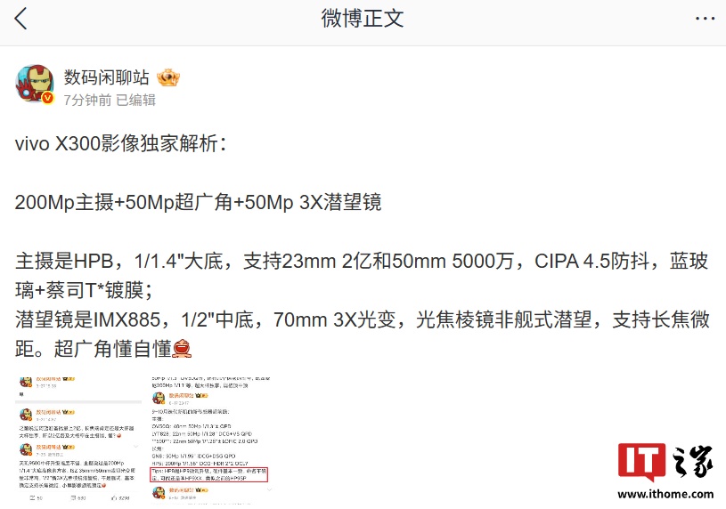 据博主 @数码闲聊站 今日分享,vivo X300 标准版新机将配备 200Mp 主摄 + 50Mp 超广角 + 50Mp 3X 潜望镜。其中主摄是 HPB(1/1.4" 大底),支持 23mm 2 亿和 50mm 5000 万、CIPA 4.5 防抖,拥有蓝玻璃 + 蔡司 T * 镀膜;潜望镜是光焦棱镜非舰式潜望,采用 IMX885(1/2" 中底),支持 70mm 3X 光变和长焦微距。