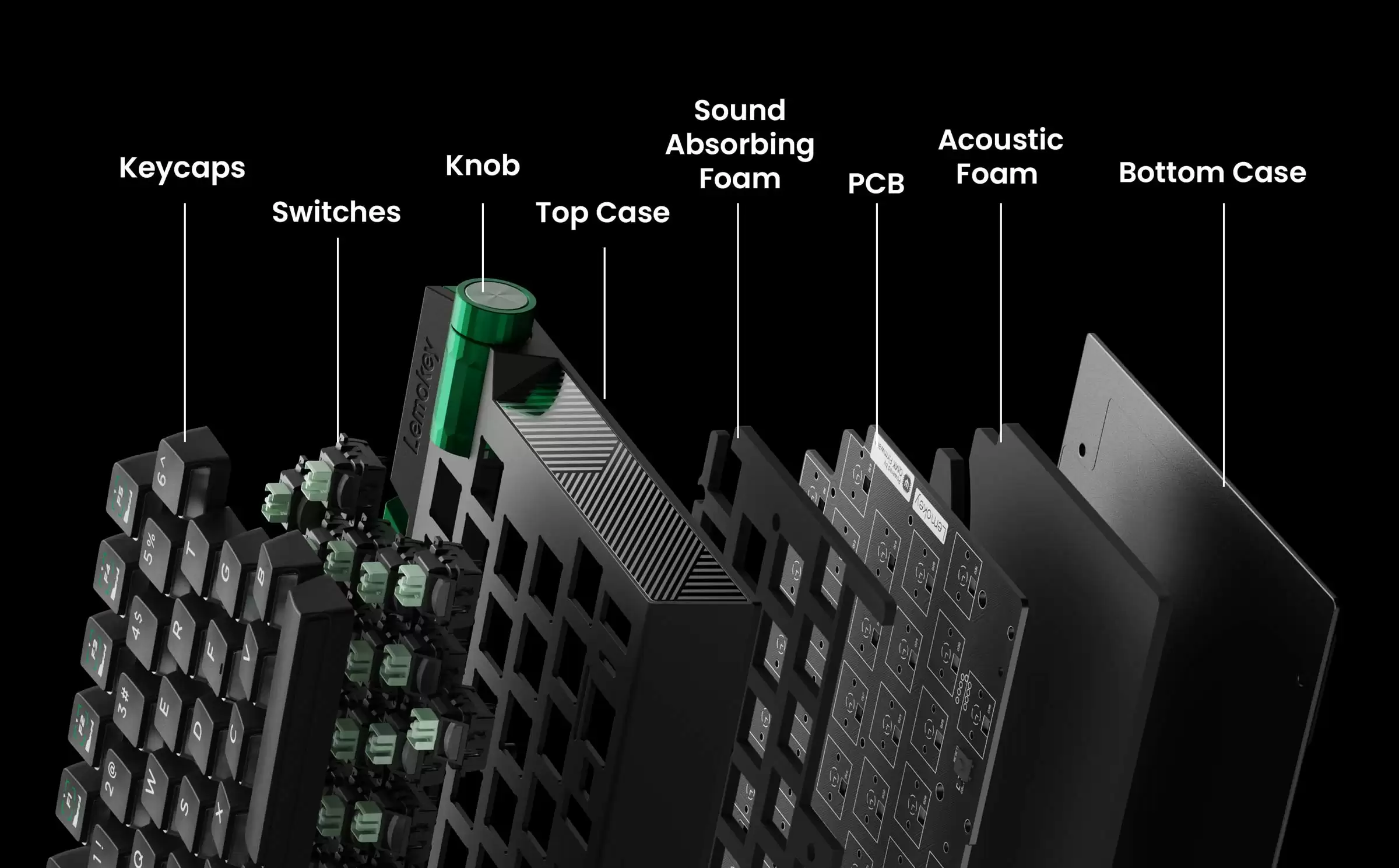 Lemokey L0 HE 键盘采用 Gasket 垫片固定,轴体经过预润滑,内部具备多层吸声结构,右上角配备多媒体旋钮;部分侧面透明的 PBT 键帽配合南向 RGB LED 塑造出独特光学效果。