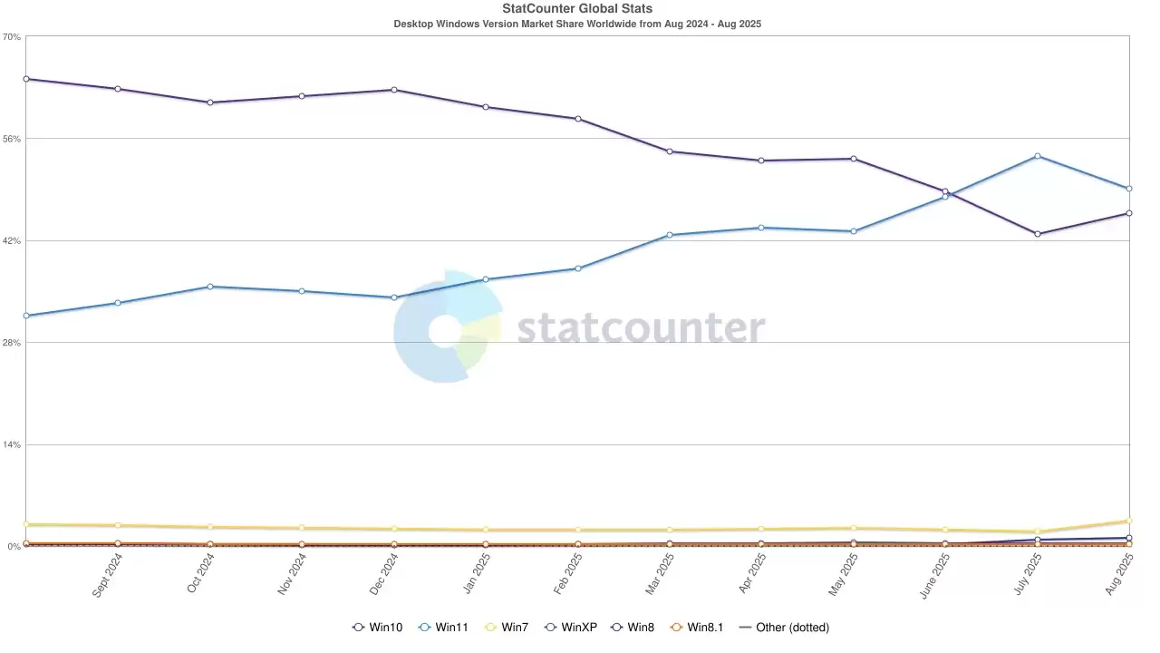 9 月 1 日消息,2025 年 9 月已至,数据分析机构 Statcounter 发布了最新的全球 Windows 系统使用数据。报告显示,Windows 11(以下简称 Win11)目前是最受欢迎的 Windows 系统版本,在所有 Windows 电脑中的占比达 49.02%。不过,继 2025 年 7 月市场份额大幅增长后,8 月份该系统占比出现小幅下滑,而 Windows 10(以下简称 Win10)的份额则有所回升。