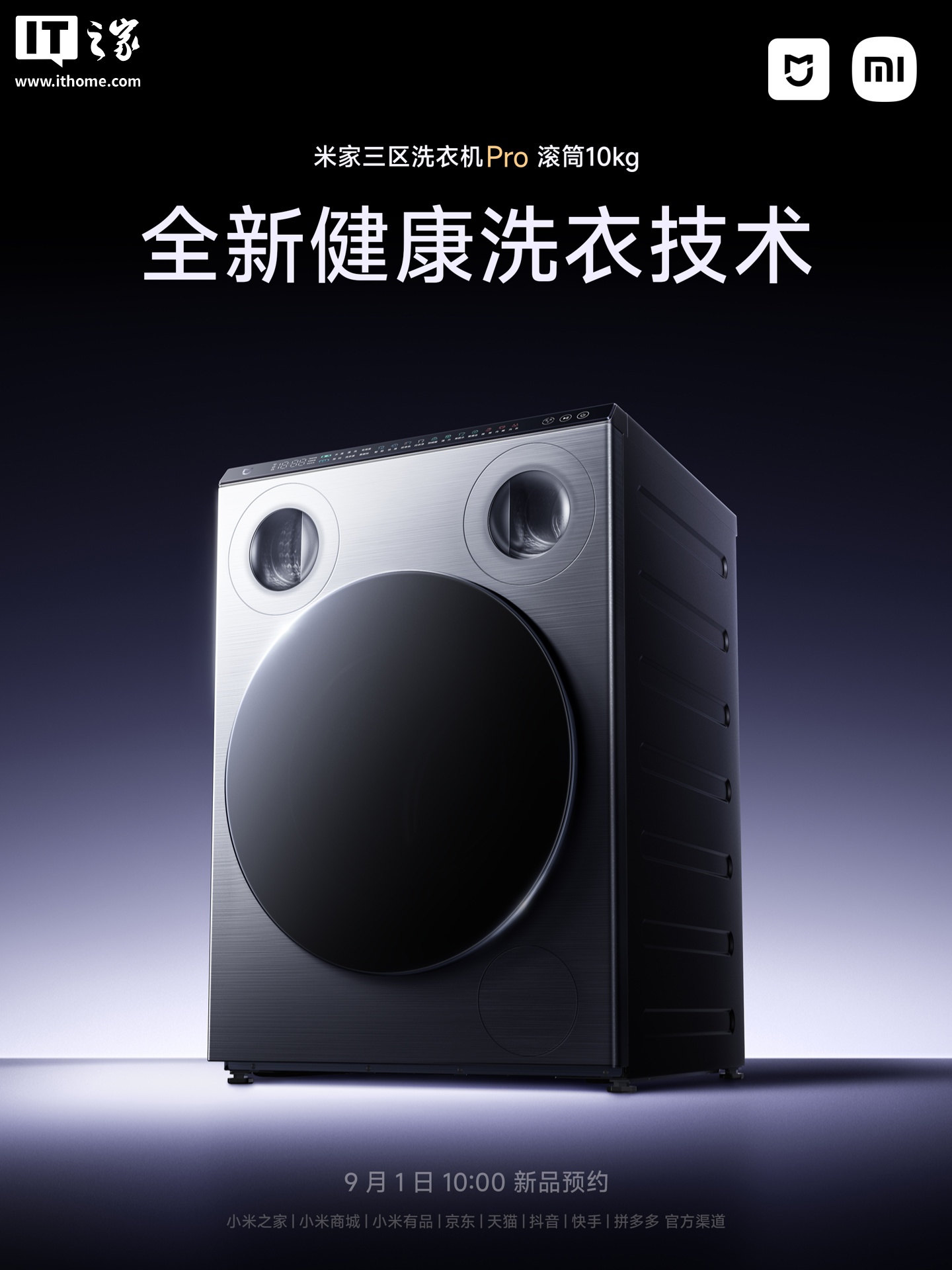 9 月 1 日消息,小米今日公布了旗下首款三区洗衣机,米家三区洗衣机 Pro 滚筒 10kg 开启预约。