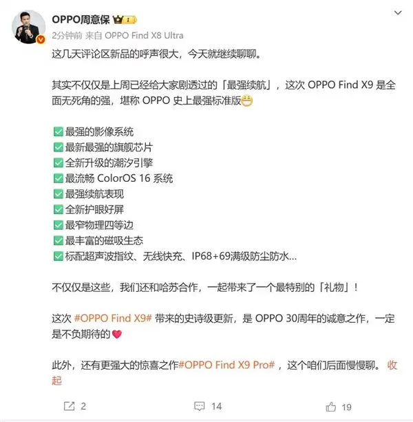 9月1日消息,OPPO Find系列产品负责人周意保预热OPPO Find X9,称“OPPO Find X9是全面无死角的强”,堪称OPPO史上最强标准版,看点如下。