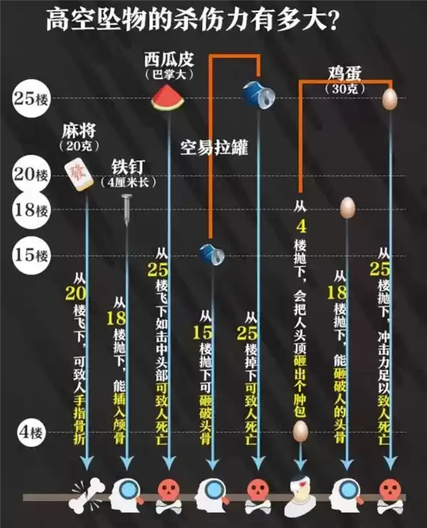 高空抛物的危害性常常被低估。相关实验表明:一枚普通鸡蛋从8楼落下可击穿头皮;一个易拉罐从15楼抛下能造成颅骨损伤;而从25楼坠落的西瓜皮,其冲击力足以夺走生命。