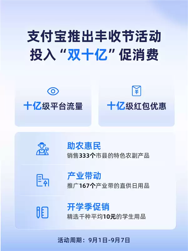 9月1日,支付宝正式启动“双十亿”福利计划,伴随金秋时节为消费者与商户送上丰厚礼遇。