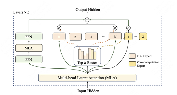 美团LongCat-Flash在架构层面引入“零计算专家(Zero-Computation Experts)”机制,总参数量560B,每token依据上下文需求仅激活18.6-31.3B参数,实现算力按需分配和高效利用。