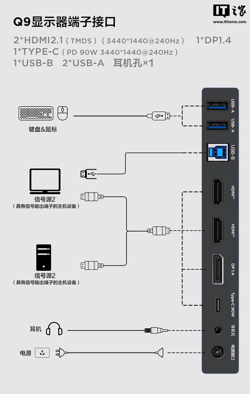 该机提供 Dancing Light 灯效系统,具备双 3W 扬声器,支持 VESA 壁挂,显示器支架支持俯仰 / 倾斜 / 旋转。提供 90W USB-C、2 个 USB-A(KVM)及对应的 USB-B 接口、2 个 HDMI 2.1 接口、1 个 DP 1.4 接口、1 个 3.5mm 音频接口。