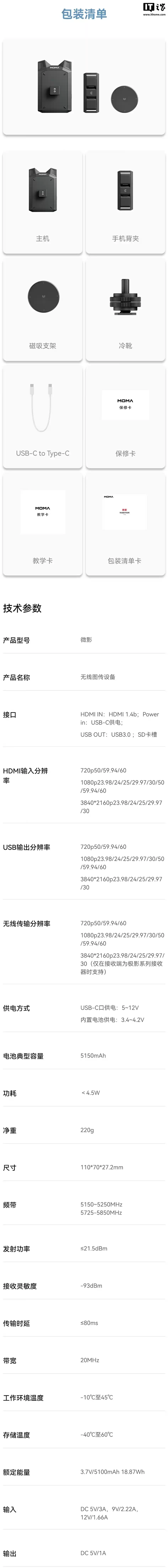 猛玛微影无线图传现已在京东发售,首发价 999 元,附参数表如下: