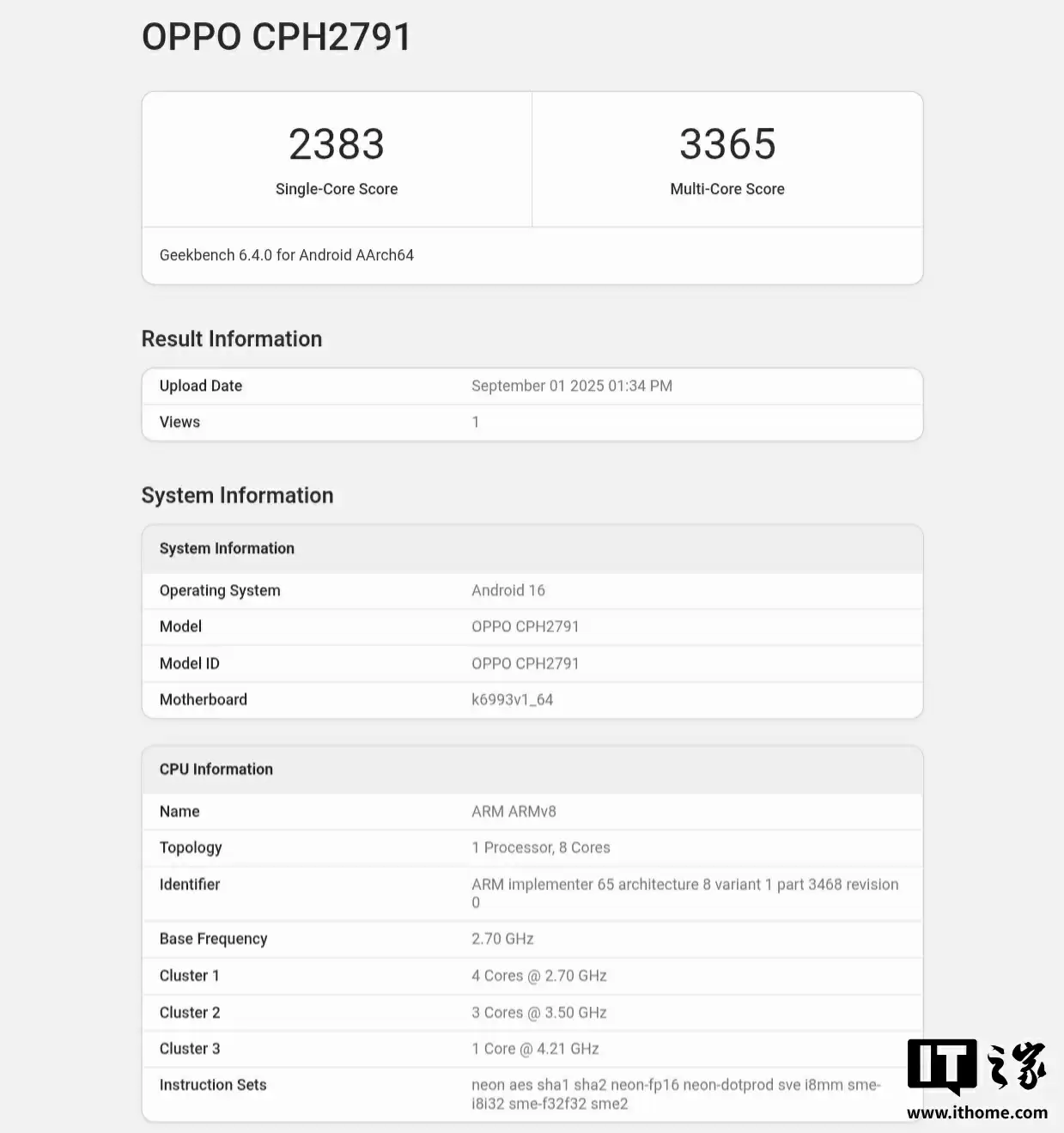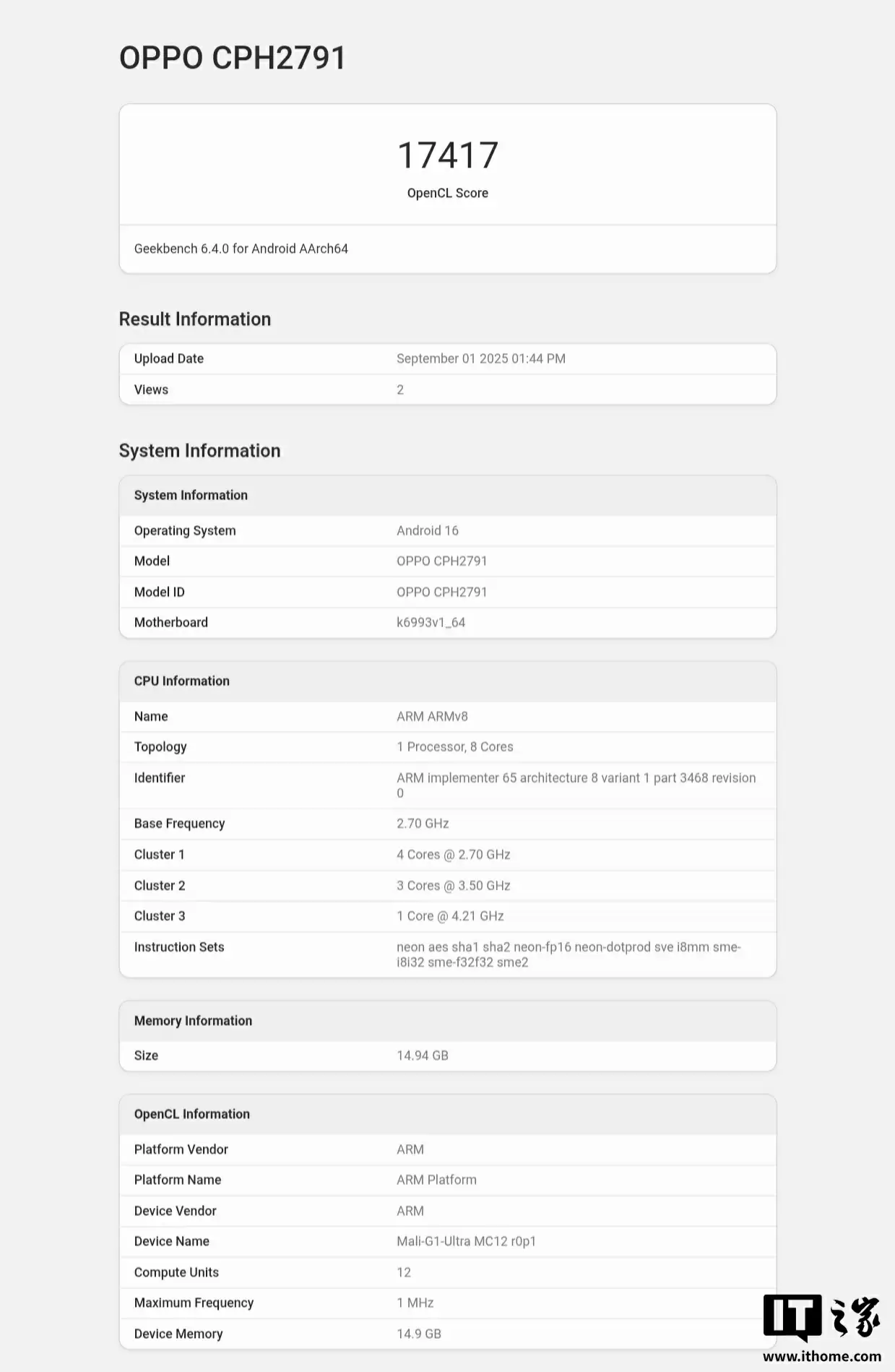 9 月 2 日消息,昨天有一款型号为 CPH2791 的 OPPO 工程机出现在了 Geekbench 中,经 Abhishek Yadav 等人确认,这就是即将发布的 OPPO Find X9。