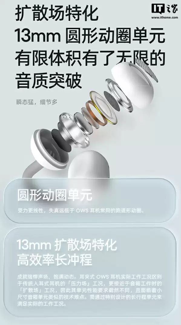 硬件参数方面,该耳机搭载了扩散场特化 13mm 圆形动圈单元,配有主动被动双重低音增强,可实时检测音频信号自动增强低音,带来更良好的低音体验。