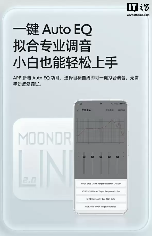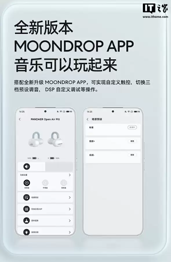 此外,这款耳机还支持 IPX4 防泼溅,搭配充电盒使用时最高续航可达 90 小时。耳机可与“MOONDROP”App 搭配使用,App 内提供图形化调音、耳机设置等功能。