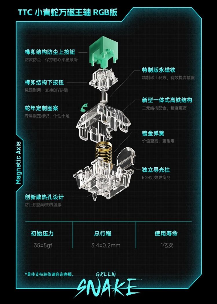 该键盘支持混轴,原装搭载的 TTC 小青蛇万磁王轴 RGB 版初始压力 35±5gf、总行程 3.4±0.2mm、使用寿命 1 亿次。此外其配备原厂高度热升华工艺键帽,键帽在左侧和下侧采用透光材质形成 L 型侧透区,能更好展示轴体光效;键盘内部包含 5 层填充结构。