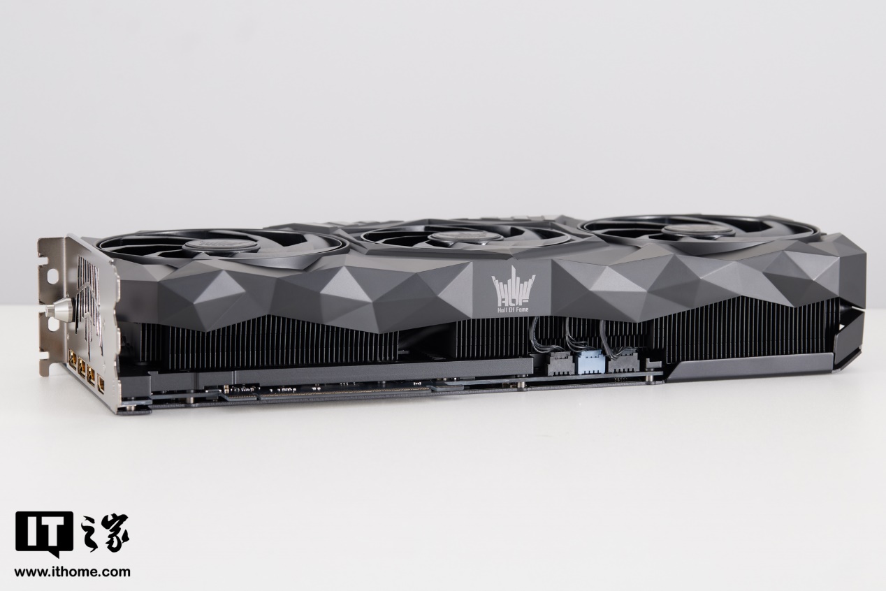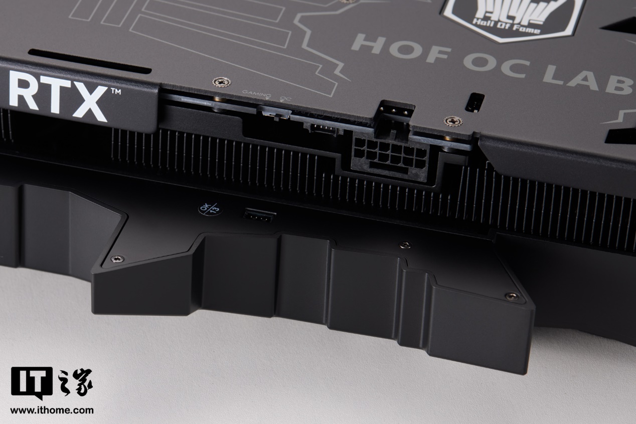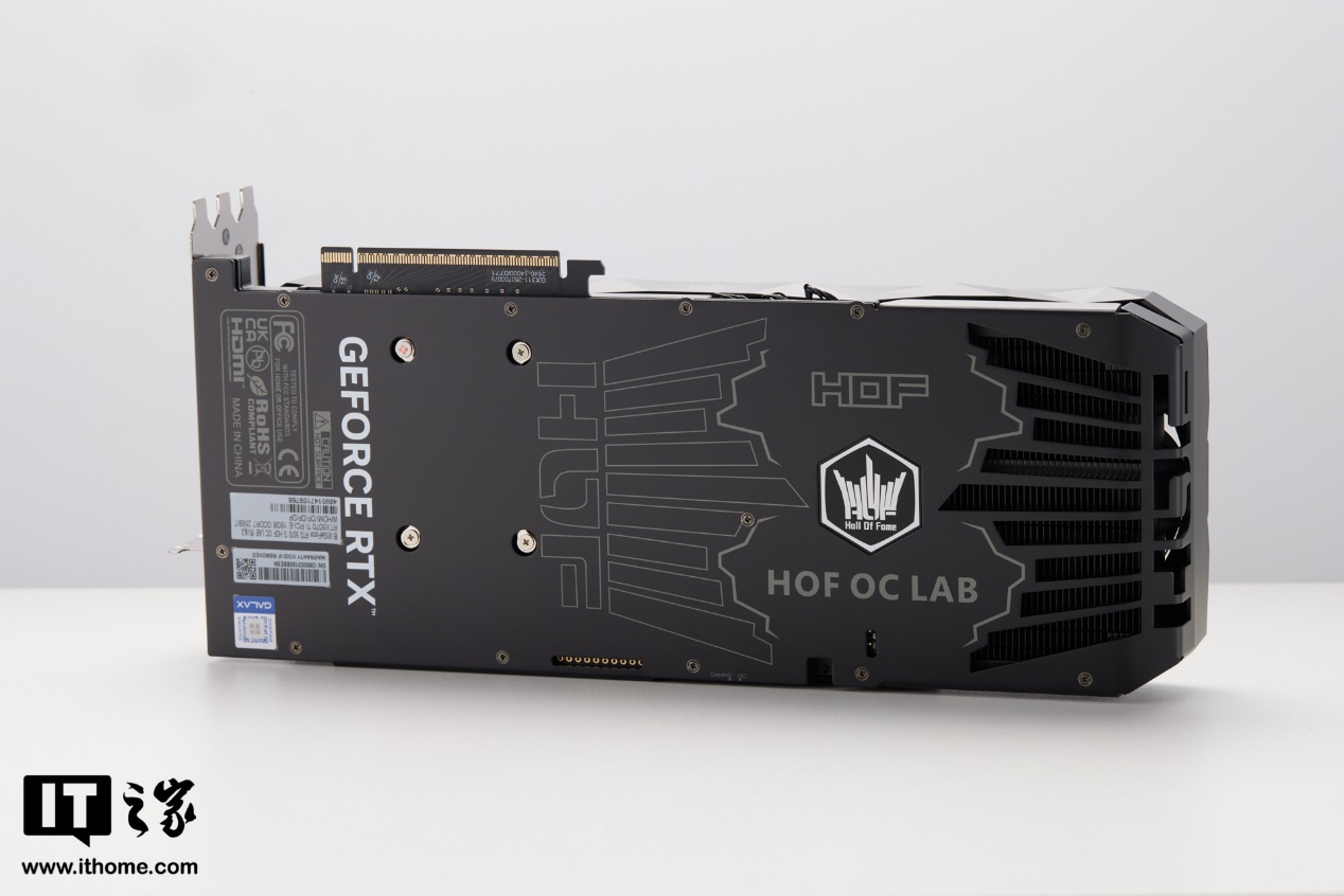 在显卡背板部分,影驰名人堂 GeForce RTX 5070 Ti HOF OC LAB 黑魂 X 设计了一个对称的双皇冠造型,左侧是描线风格装饰,右侧则是实打实的镂空散热开孔,连 HOF Logo 造型的开口都做了进去,细节拉满。