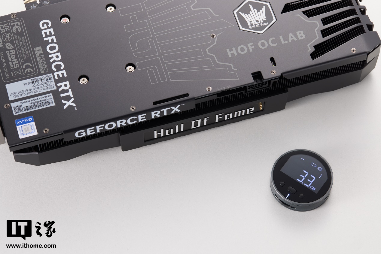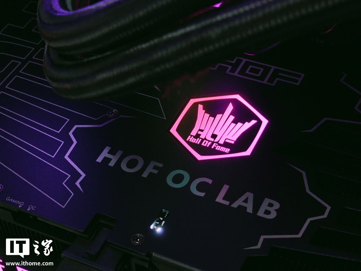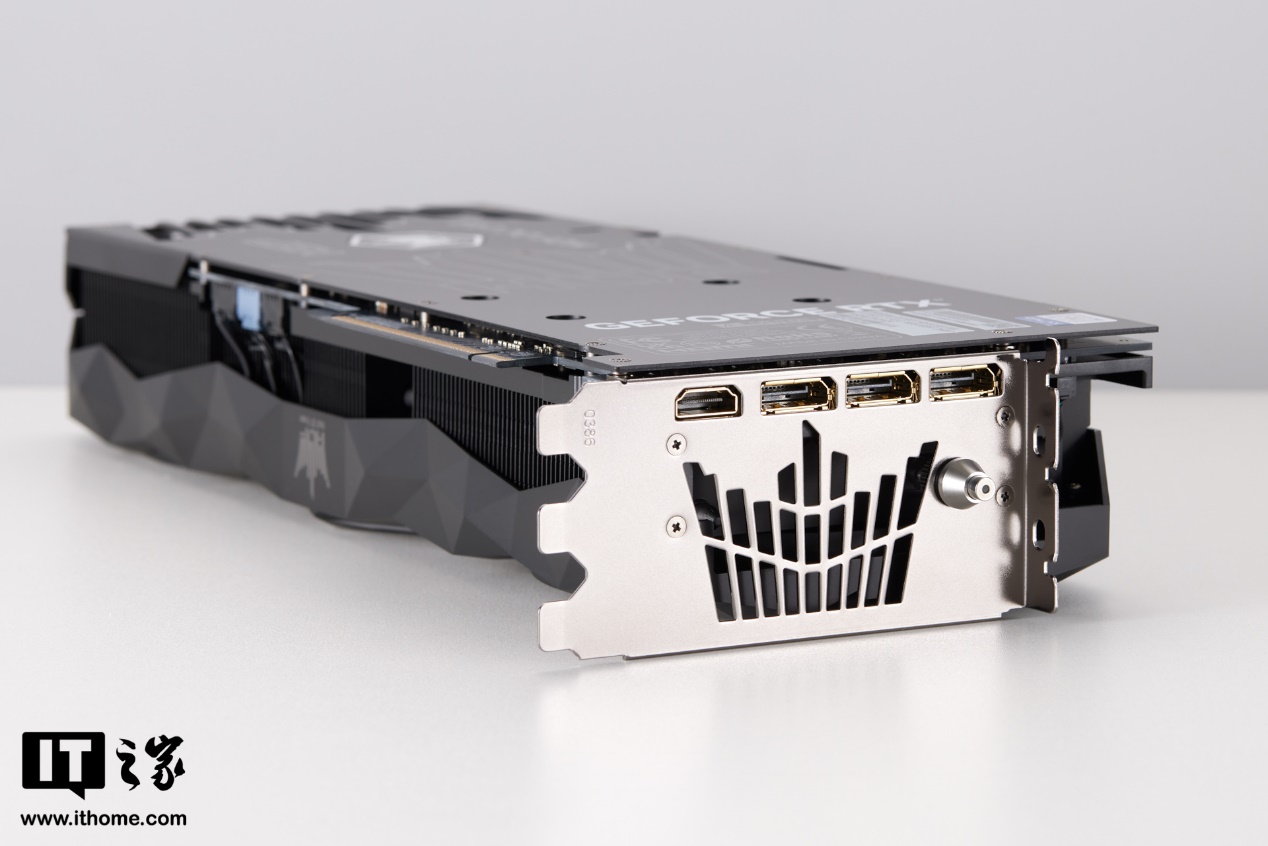 在显卡背板部分,影驰名人堂 GeForce RTX 5070 Ti HOF OC LAB 黑魂 X 设计了一个对称的双皇冠造型,左侧是描线风格装饰,右侧则是实打实的镂空散热开孔,连 HOF Logo 造型的开口都做了进去,细节拉满。