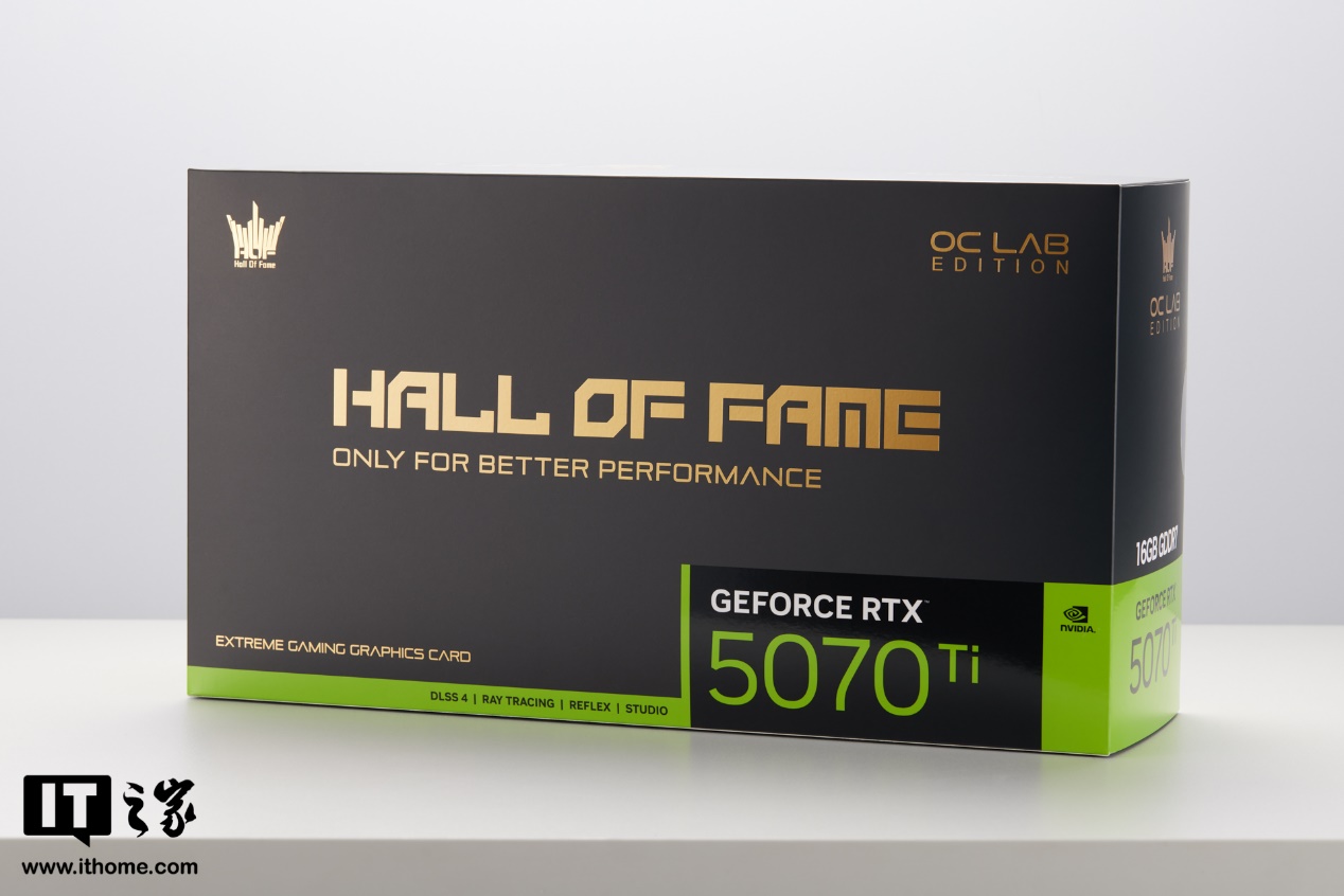 影驰名人堂 GeForce RTX 5070 Ti HOF OC LAB 黑魂 X 显卡采用黑色方形包装设计,包装正面除 NVIDIA 相关标志和型号信息,其它文字均采用烫金色字体印刷,凸显其旗舰定位,最显眼的位置是 HALL OF FAME(名人堂)标志。