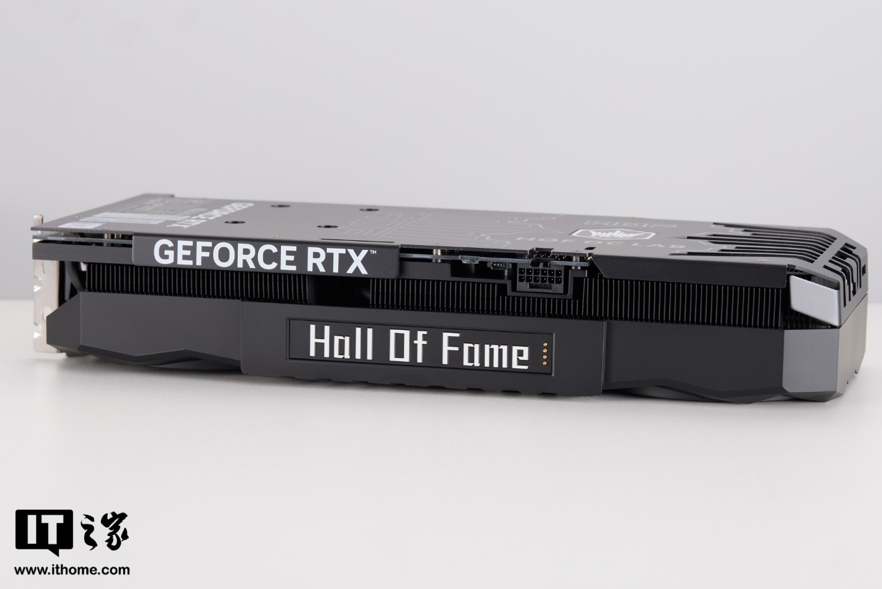 显卡侧面也保留了 Hall of Fame 的 RGB 灯带,横装时不加“皇冠头”,也能拥有炫酷的 RGB 效果,整张显卡的 RGB 灯效非常丰富,无论怎么装都难掩 HOF 高调的灯光效果。