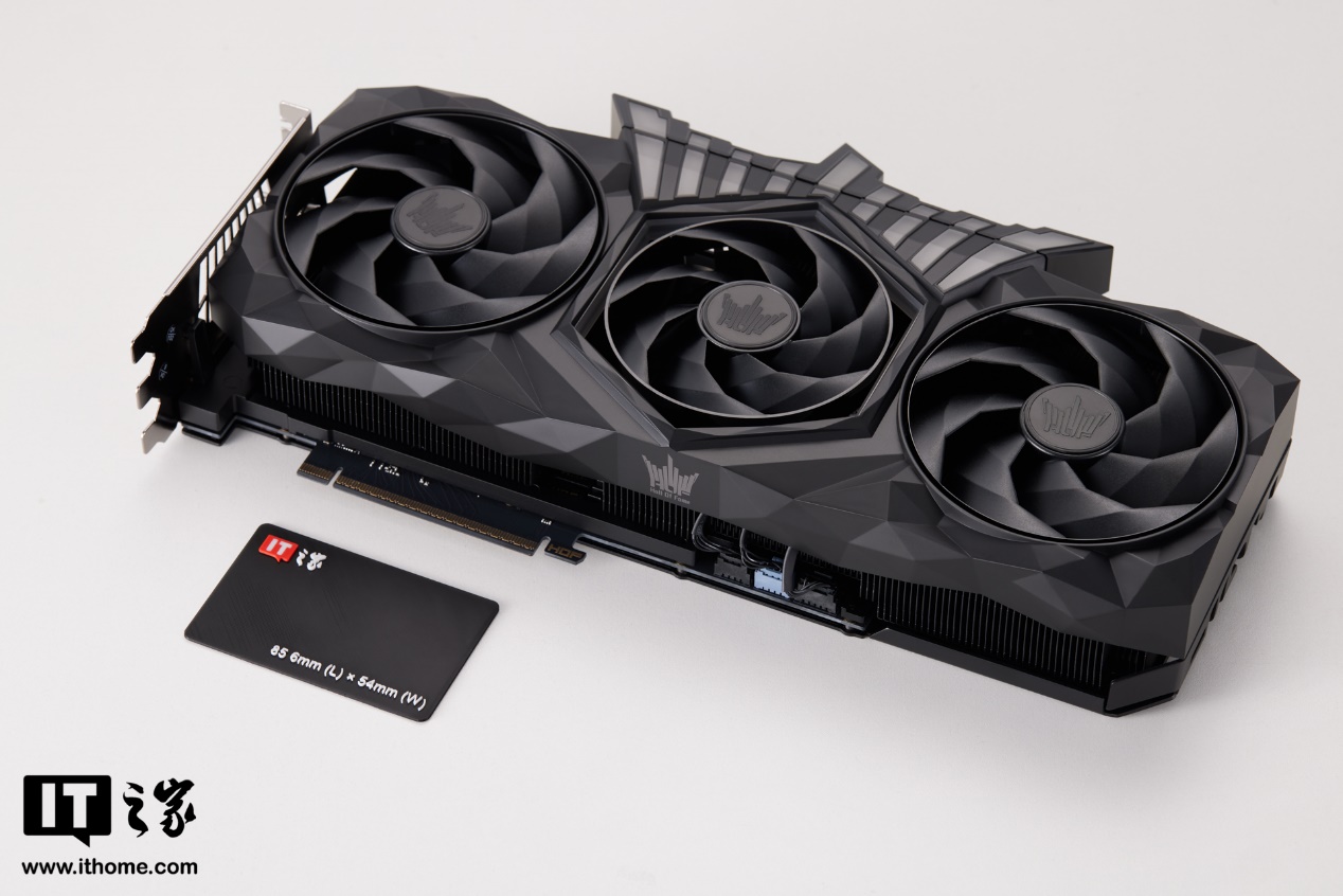 整体设计元素和白色款新品基本一致,显卡装甲采用大面积的棱形不规则装饰,层次感极强。中间风扇周围做了一圈六边形灯带,扇叶为三折优化设计,风扇顶部还有一个带有 RGB 灯效的皇冠图案,配合包装内附送的磁吸灯带模块,可组成完全体状态。