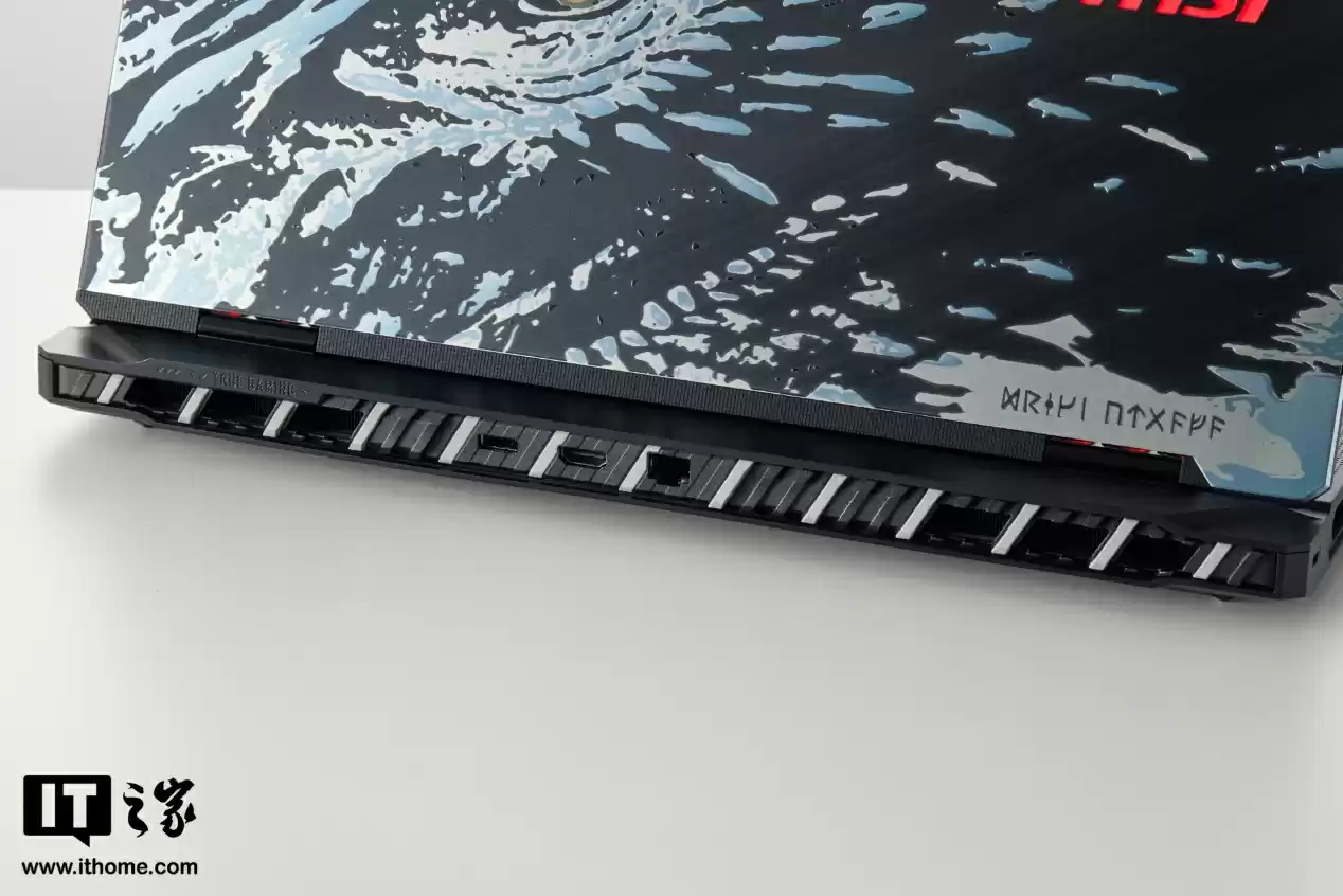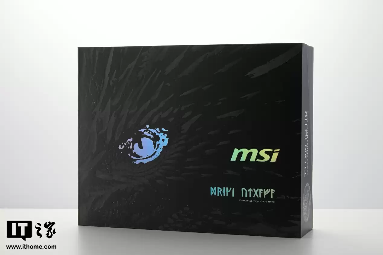 官方透露看似简单的涂装纹理,实际经过了多道工艺,包括雕刻、浸泡、再雕刻、抛光以及多彩上色,最终通过复杂蚀刻技术来展现如同雕刻般的手工质感。实际上手会发现,所有亮色部分都略有突起,好似亲自抚摸龙身一般。A 面左上角和右下角都有做北欧卢恩符文文字,虽然看不懂但大体也能猜出右下角字符的含义就是“龙魂典藏版”。右侧中间的 MSI Logo 支持 RGB 灯效,搭配 A 面涂装更显机皇身份。