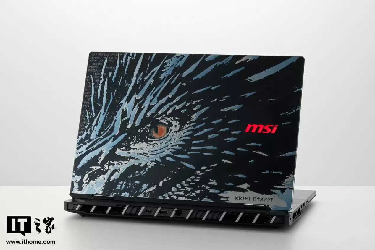 微星泰坦 18 Ultra 龙魂典藏版的 A 面是一条极具视觉冲击力的手绘风格龙头形象,黑色加蓝色的涂装配色,展现出如同雕刻般精细的龙鳞细节,加上一颗橘色龙眼,将北欧冰龙的霸气展现得淋漓尽致。