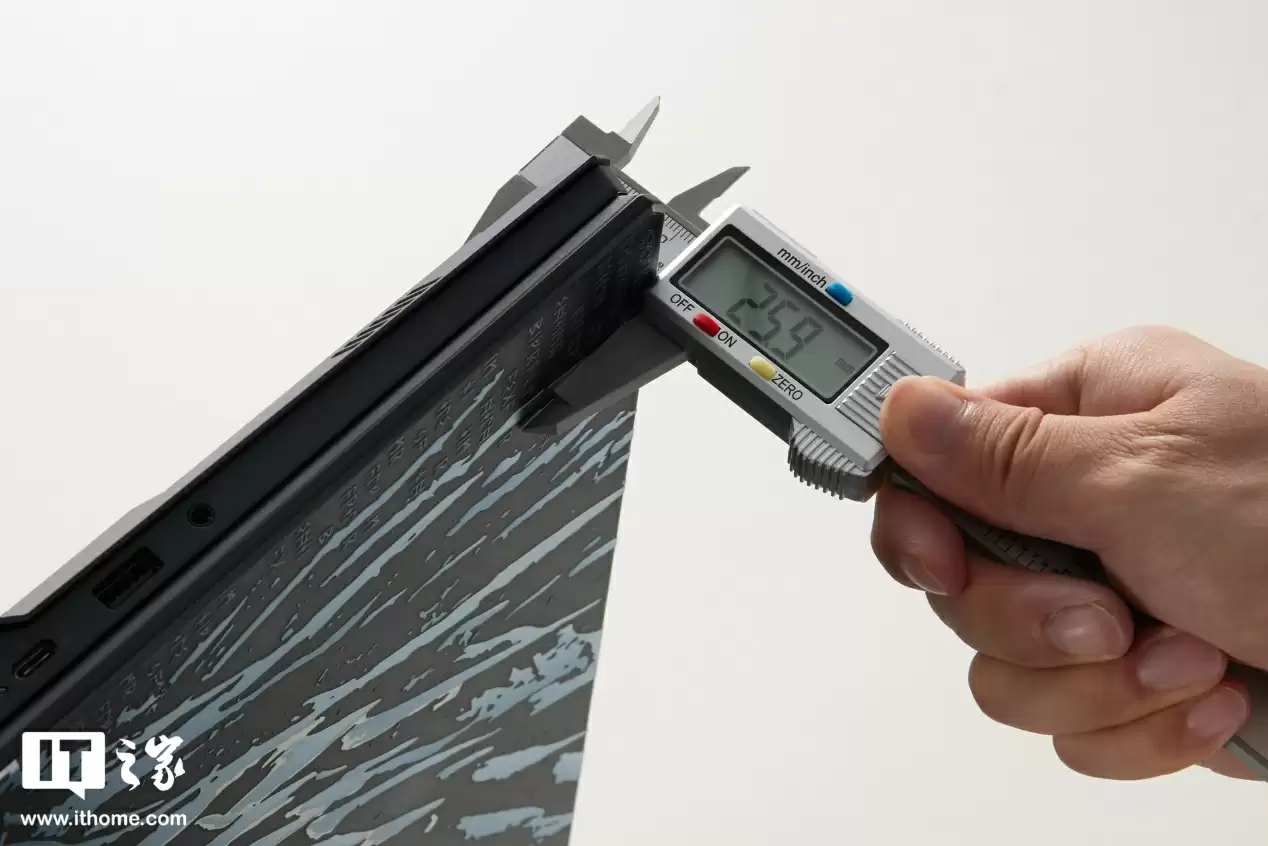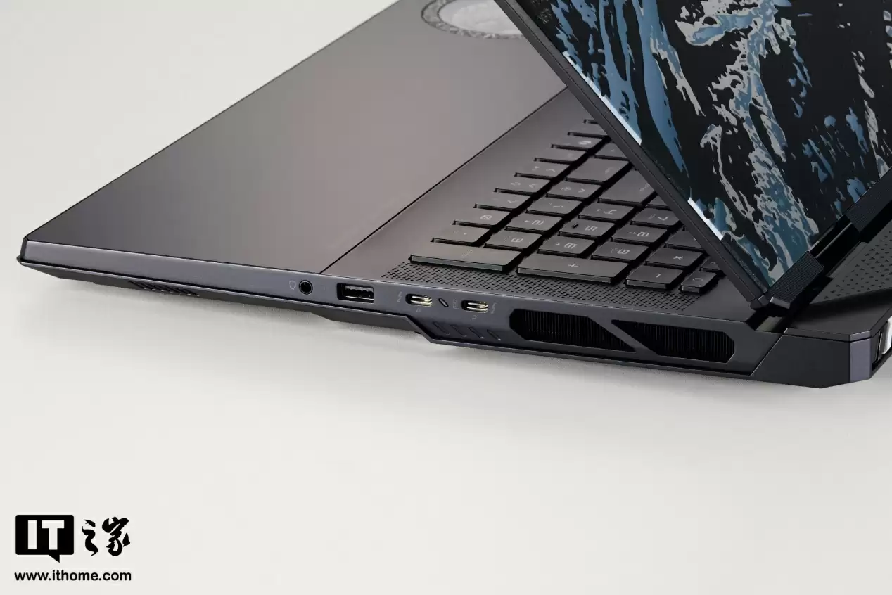 机身右侧配备 2 个全功能雷电 5 协议 Type-C 接口(支持 DP 视频输出和 PD3.1 140W 供电)、1 个 USB3.2 A 口(10G 速率)以及 1 个 3.5mm 音频接口。