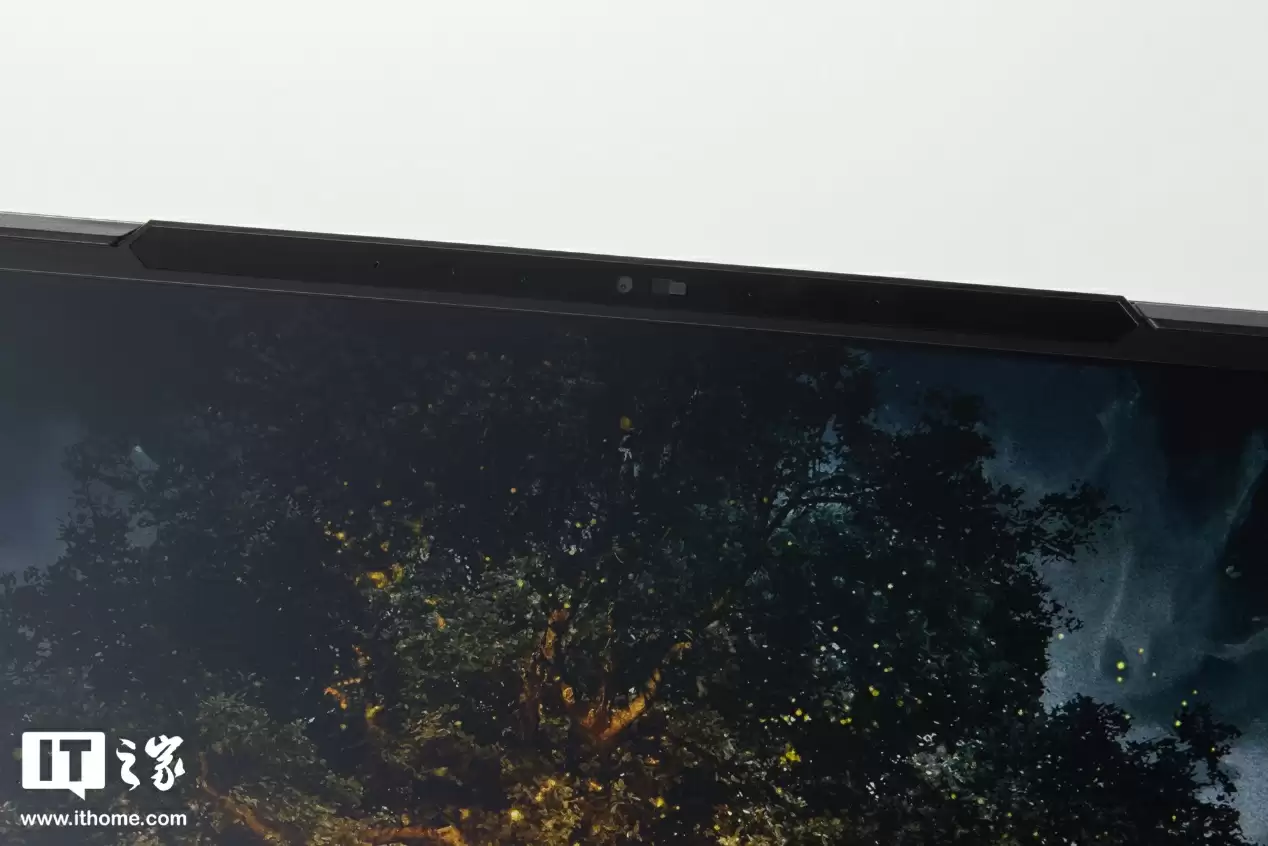 屏幕顶部边框有一条凸起设计,将 IR 摄像头(支持 Windows Hello 面容解锁)、物理防窥遮罩、传感器和麦克风阵列等一并收纳其中。
