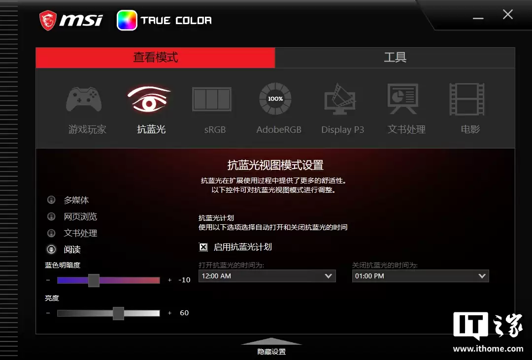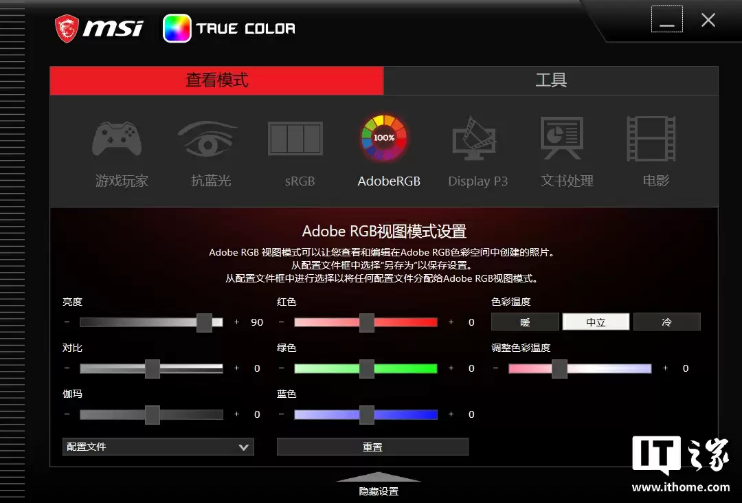 除了出色的硬件素质外,微星还为用户提供了一款专业的屏幕色彩管理工具 MSI True Color ,它提供 3 种专业色域和 4 种场景模式切换,支持丰富详细的自定义选项,也可以上传三方配置文件进行校色。