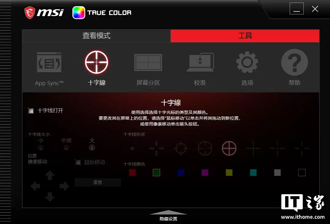 MSI True Color 还提供了一些实用工具,例如屏幕校准、应用独立显示模式匹配(App Sync)、屏幕十字准星等,帮助用户在具体应用和游戏中获得最佳显示体验。