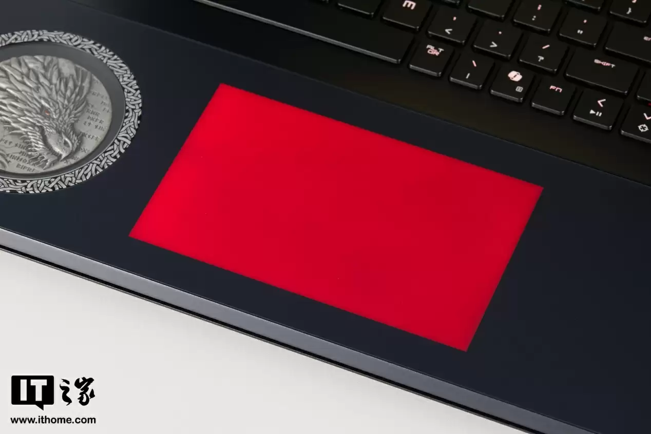 徽章右侧是一大片纯平区域,原本应有的触控板离奇“消失”了,让人有些摸不着头脑。然而开机之后,原本隐藏起来的触控板便会亮起均匀灯光,浮现在用户眼帘。这个设计非常巧妙,由于掌托部分采用了整块玻璃材质,将整块 RGB 触控板无缝嵌入其中,使得 C 面的观感一体性更强的同时,也进一步增强了产品的科技感。