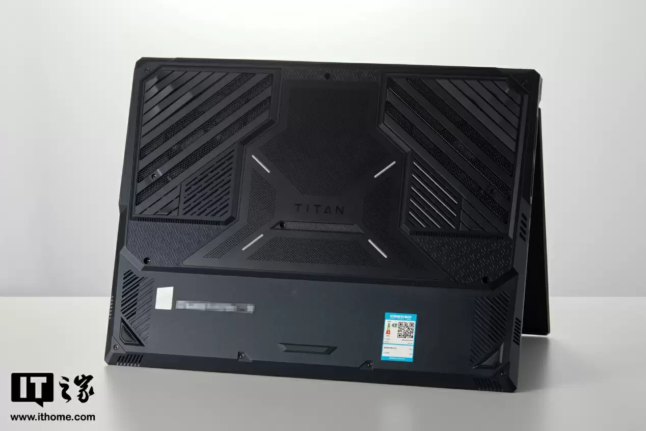 D 壳的设计比较大气,无论是上方脚垫还是散热进气开孔都做成了斜切设计,中间还有后一大块独立的开孔区域,上面印着 TITAN 的字样,下方两侧还有 2 个扬声器开孔,整机一共配备了 6 个丹拿调音的扬声器阵列。