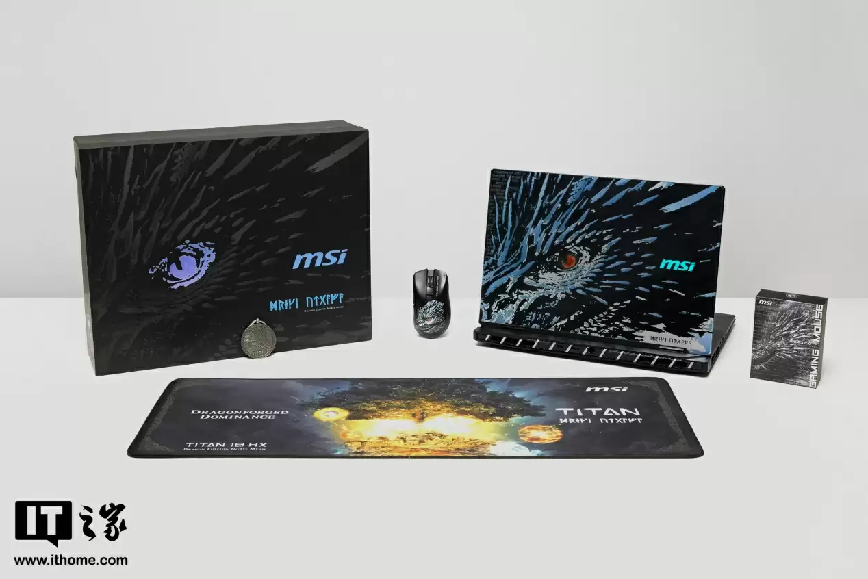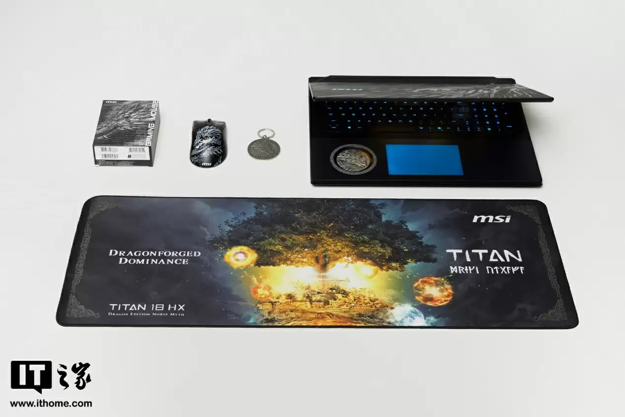 配件方面,微星泰坦 18 Ultra 龙魂典藏版采用定制彩盒包装,除了应有的电源适配器外,还附送了龙魂对应主题的鼠标、鼠标垫以及一枚龙魂钥匙扣徽章。