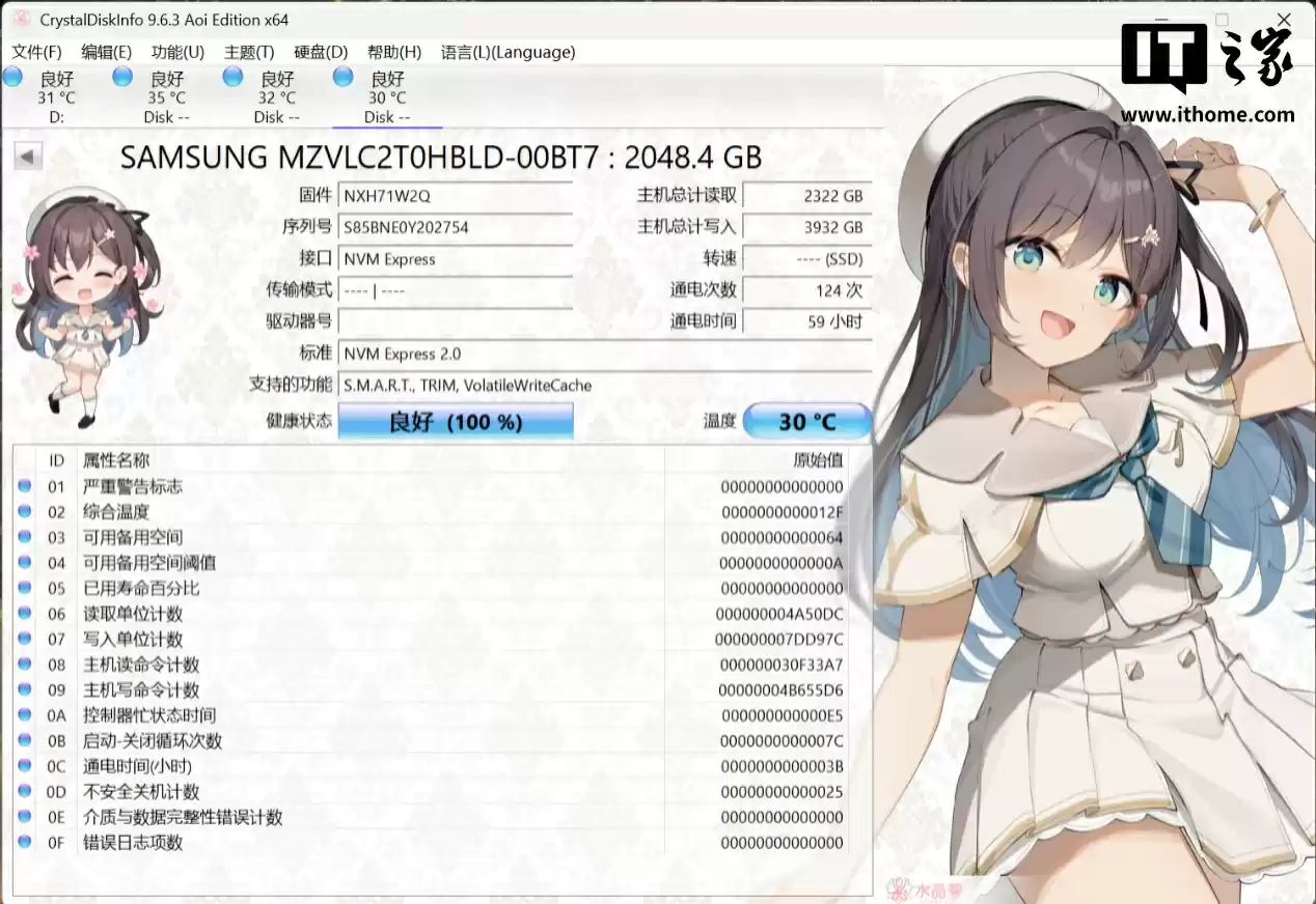 还有 2 条 2TB 容量的三星 MZVL22T0HDLB-00BT7 固态,也就是 PCIe4.0 x4 规格的 OEM 版本三星 PM9A1a,理论顺序读写速度分别为 7GB/s 和 5.1GB/s。