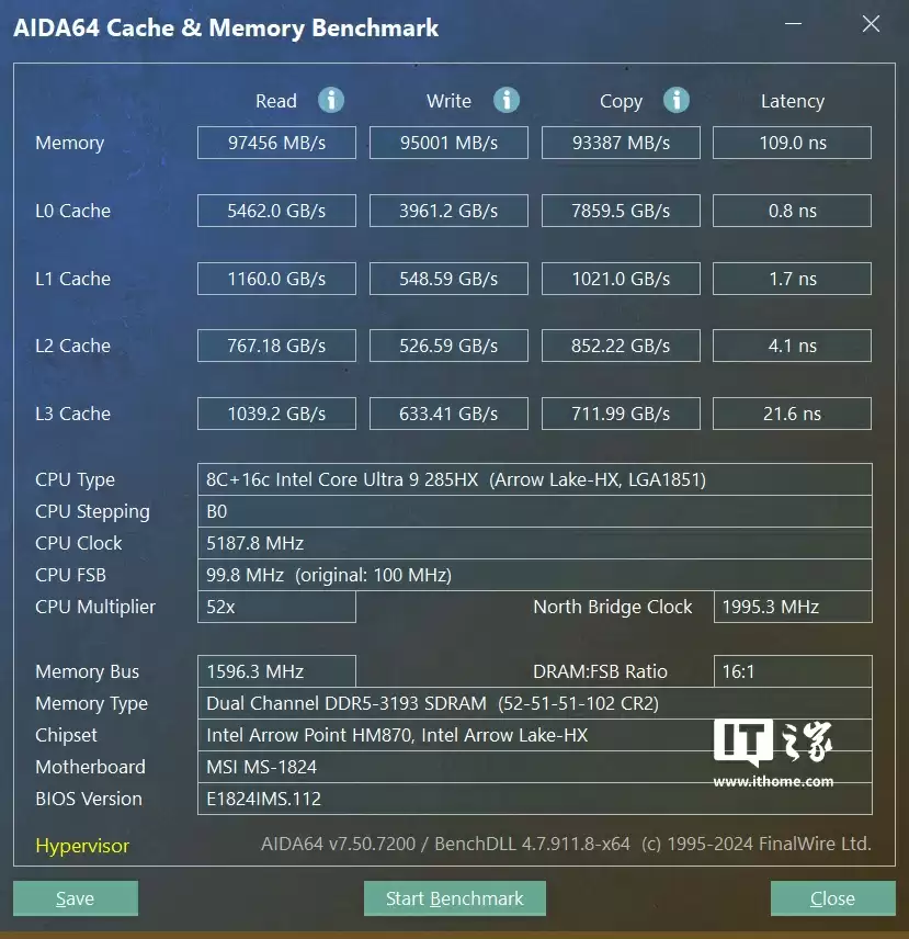 实测的内存跑分数据如图所示,读写的平均速度都在 95000MB/s 以上,拷贝速度也有 93000MB/s,内存延迟达到了 109ns 还是比较高的,当然这里面是有酷睿 Ultra 9 285HX 处理器的多 Die 设计原因所造成的影响。