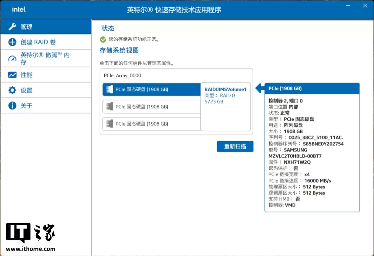 不仅如此,这台电脑出厂就通过英特尔快速存储技术将 3 块固态组成了 1 块容量高达 6TB 的 Raid 0 阵列盘,通过软件的硬盘管理页面可以看到,3 块硬盘的实际容量为 1908GB,总容量为 5723GB。Raid 理论最大连接速度为 18000MB/s,那么实际表现能否达到这个速度水平呢?