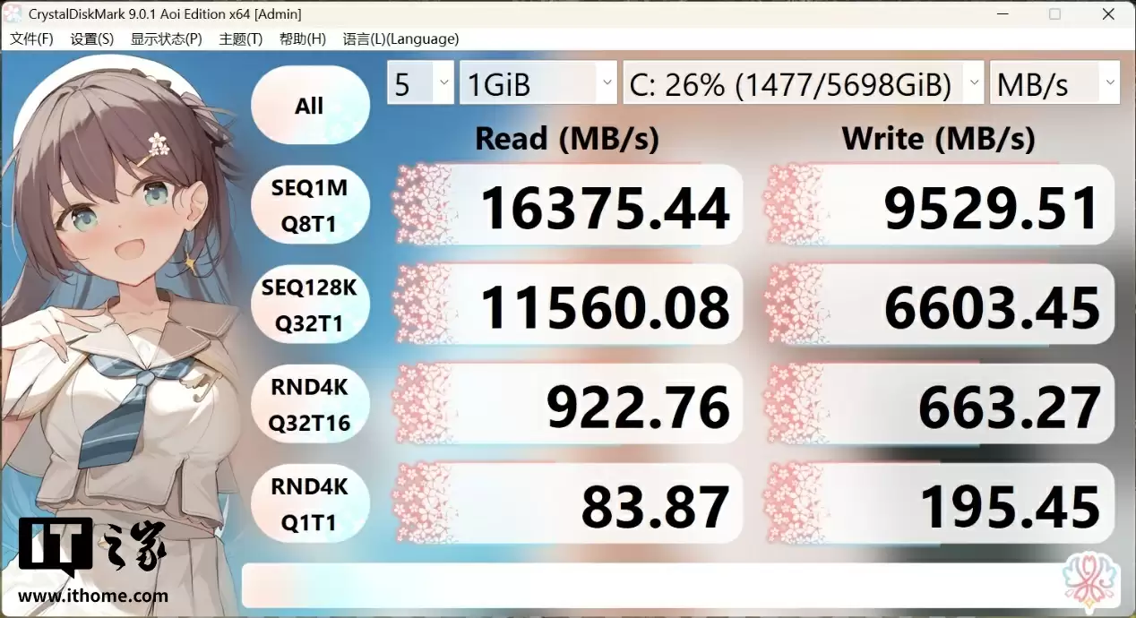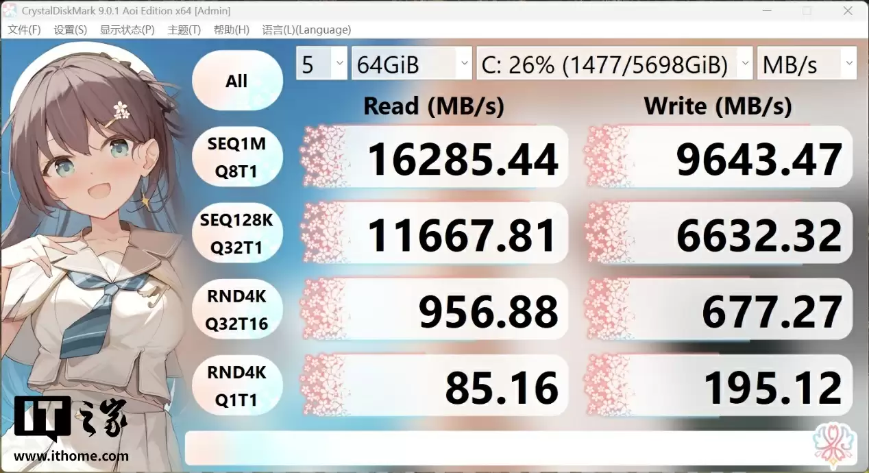 我们分别用 CDM 硬盘测试工具在 1GB 文件大小和 64GB 文件大小模式下进行测试,如上图所示其 Raid0 阵列盘的顺序读取速度均达到了 16GB/s 以上,顺序写入速度也有 9.5GB/s 左右,顺序读取速度相比 PM9E1 标称的 14.5GB/s 还要高出 1.5GB/s,非常夸张。相对而言,4K 随机读写速度就没有那么惊艳了,属于 PCIe4.0 x4 固态的常规水平。