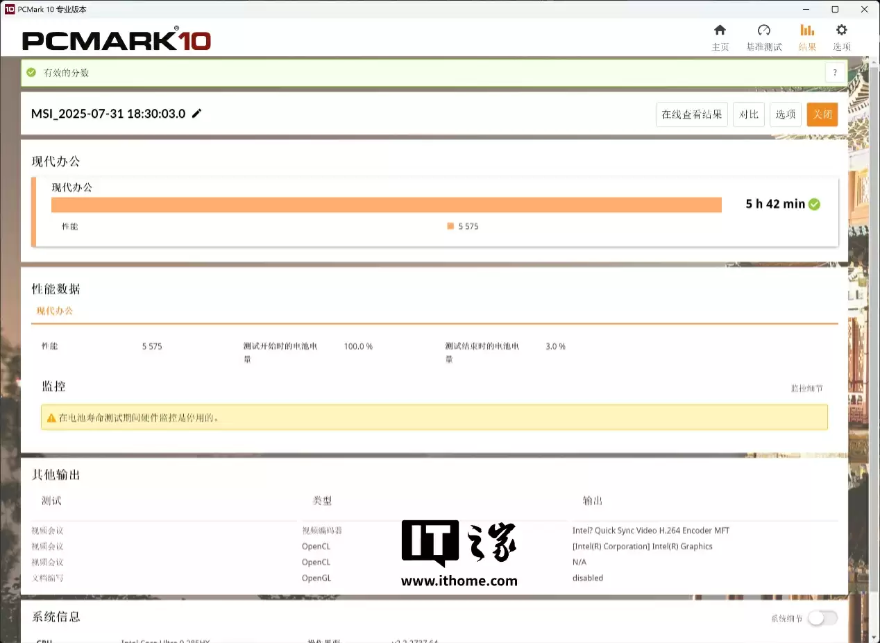 微星泰坦 18 Ultra 龙魂典藏版的电池容量为 99.9Whr,续航表现我们通过 PC Mark 10 现代办公项目进行了实测,在 50% 亮度和纯核显输出模式下测得理论续航成绩 5 小时 42 分钟,毕竟搭载了 18 英寸 4K Mini LED 屏幕这个“耗电大户”,续航成绩算不错了。
