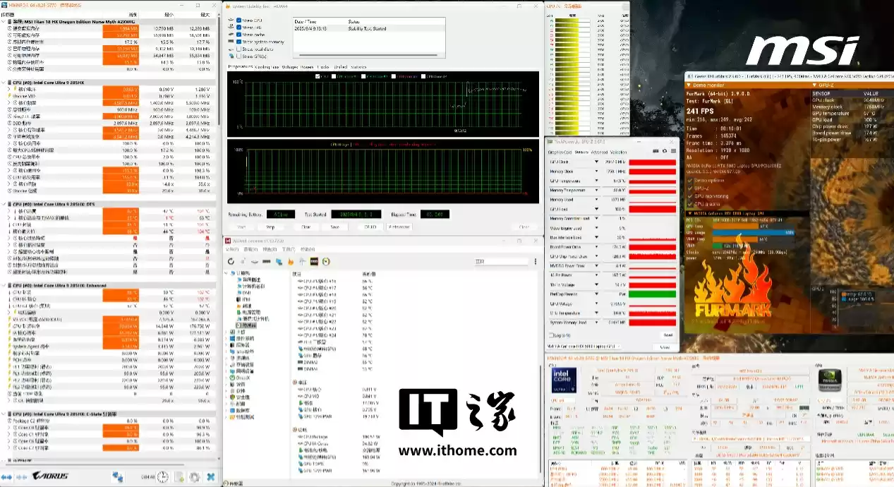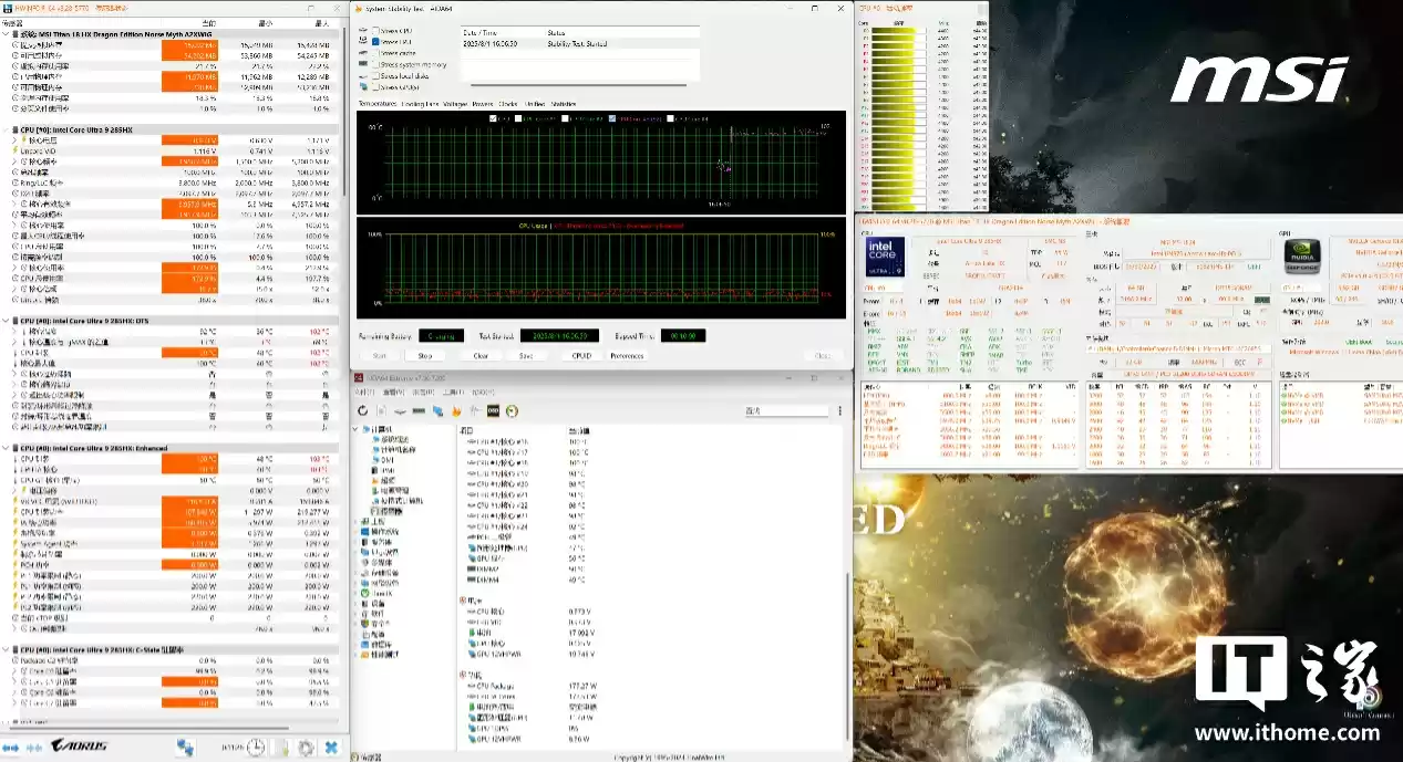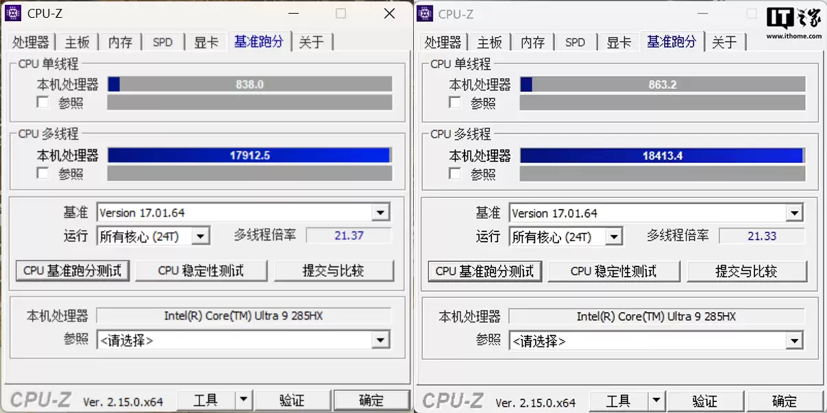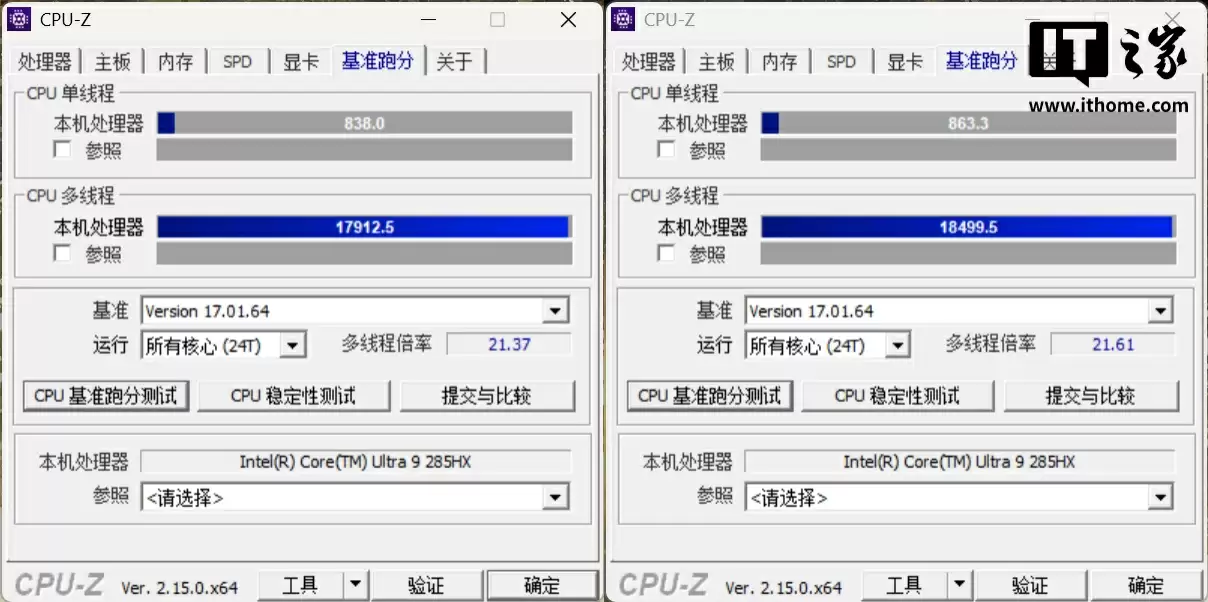 在性能测试环节,我们遇到了一个小插曲。我们发现即使开启 MSI Center 中的狂暴模式(散热加速),跑分却打不过整机功耗更低的微星泰坦 18 Pro AI 2025,而且还不是几十分的差距。比如在 CPU-Z 的跑分上,单核跑分低了 25 分,性能下降了 2.8%;多核跑分少了 501 分,性能下降了 2.7%。
