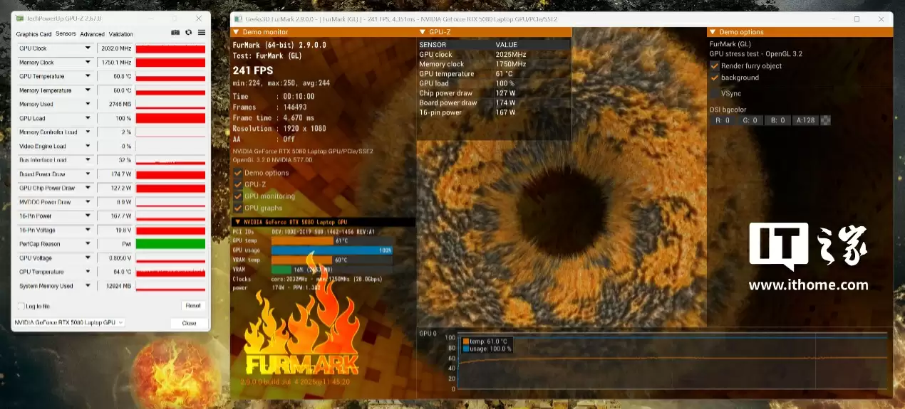 最后是双烤表现,经过 10 分钟烤机后 CPU 功耗保持在 100W 左右,GPU 功耗保持在 170W 左右,整机功耗确实可以维持在 270W 的水平。此时 CPU 温度为 86℃,GPU 温度为 67℃,散热能力堪称恐怖。频率方面,CPU 的 P 核与 E 核均在 3.7GHz 左右,GPU 频率则依旧能保持在 2000MHz。