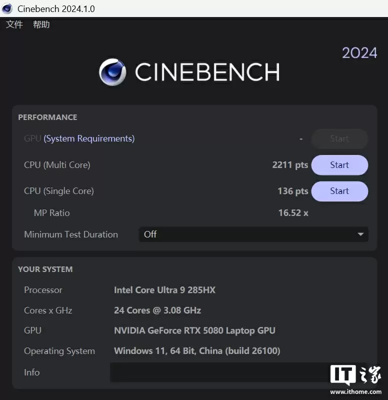 在 CineBench 2024 测试中,CPU 单核分数为 136 分,多核分数为 2211 分。