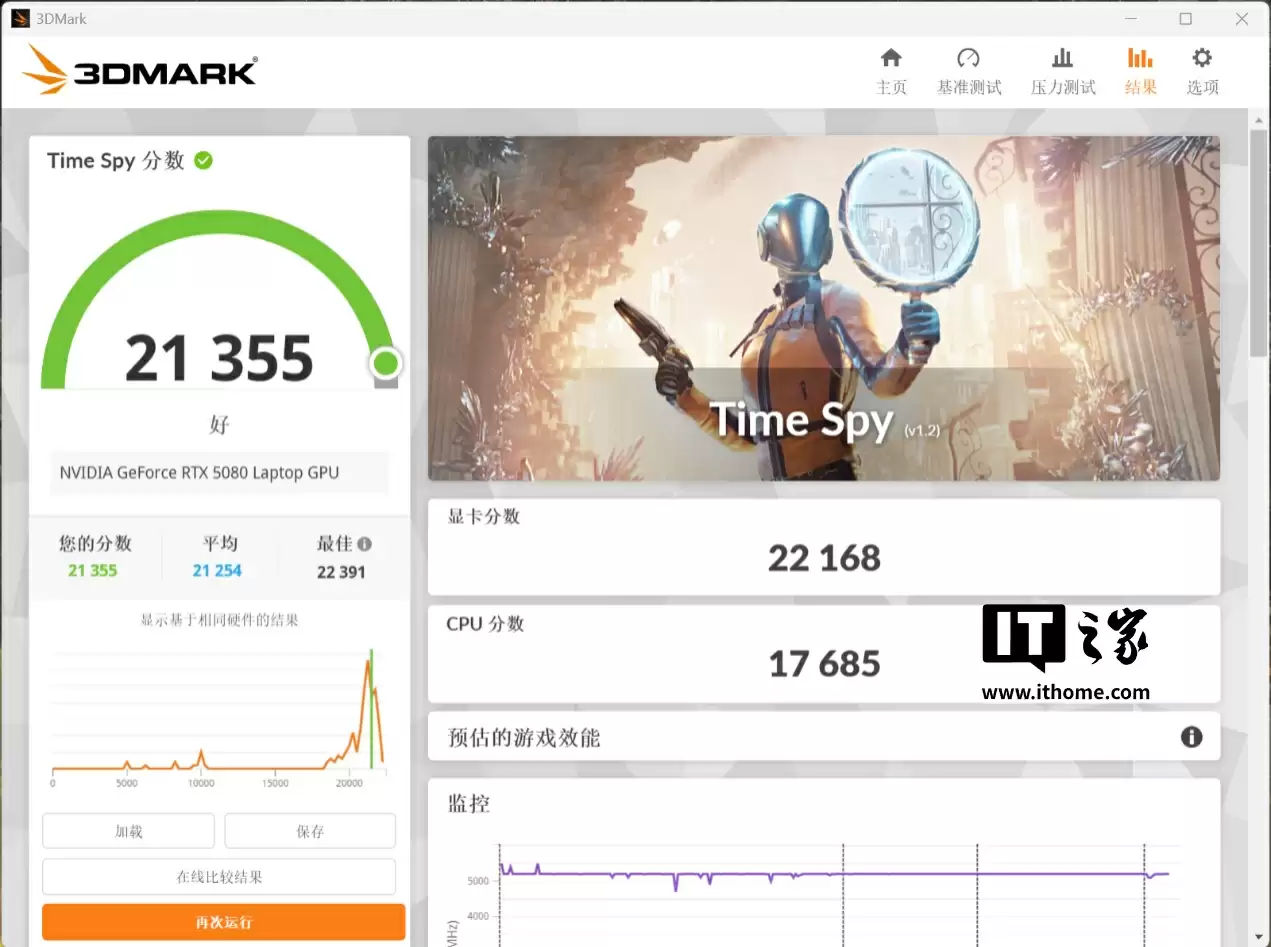 接下来再看看 RTX 5080 显卡的表现。在 3D Mark Time Spy 测试中,RTX 5080 的显卡分为 22168 分。在 3D Mark Time Spy Extreme 测试中,显卡分数为 10803 分。