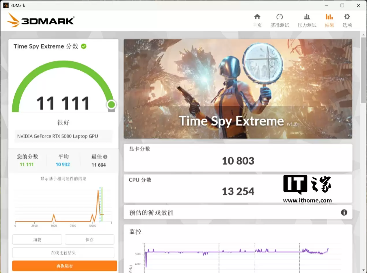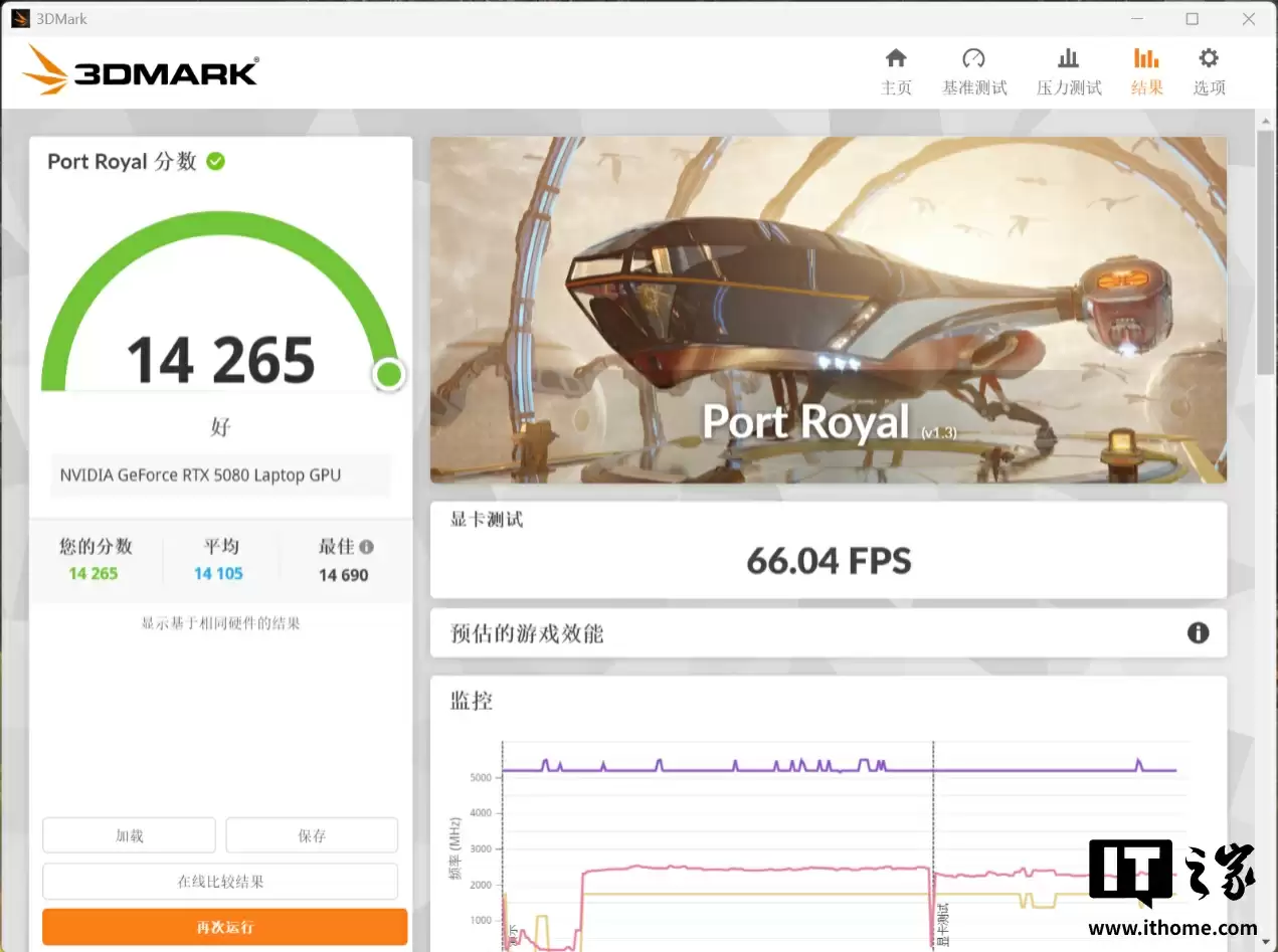 而在考验光追表现的 3D Mark Port Royal 测试中,RTX 5080 显卡获得了 14256 分的综合分以及 66.04 的 FPS 帧数。