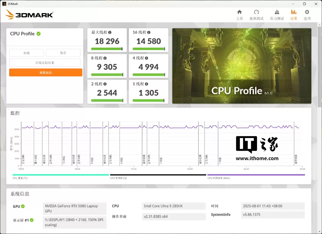 在 3D Mark CPU Profile 测试中,酷睿 Ultra 9 处理器 285HX 的单线程分数为 1305 分,最大线程分数为 18296 分。