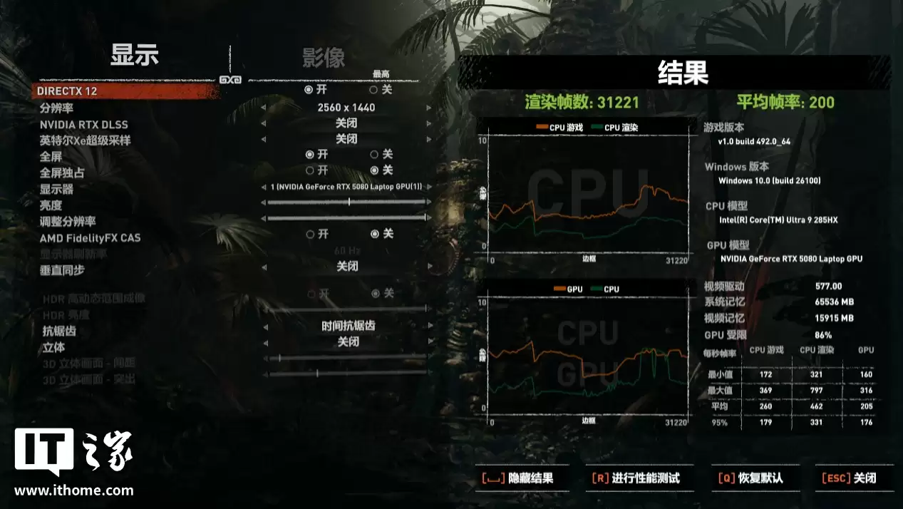 作为光栅性能的代表测试项目,使用游戏自带基准测试: