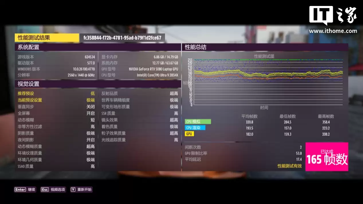在 2K 极端画质下游戏平均帧数 165 帧,1% Low 帧 110 帧;