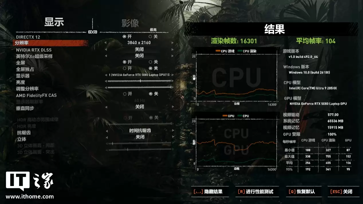 在 4K 最高画质下游戏平均帧数 104 帧,1% Low 帧 87 帧。