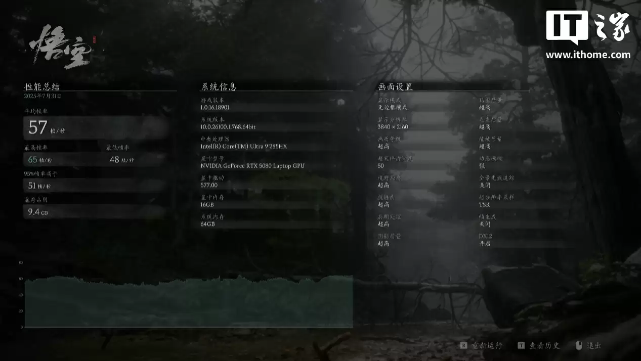 《黑神话:悟空》的全景光线追踪技术让这款游戏对性能要求极高,在 4K 分辨率加超高画质,TSR 50% 超采样,关闭光线追踪的情况下,游戏平均帧数只有 57 帧。