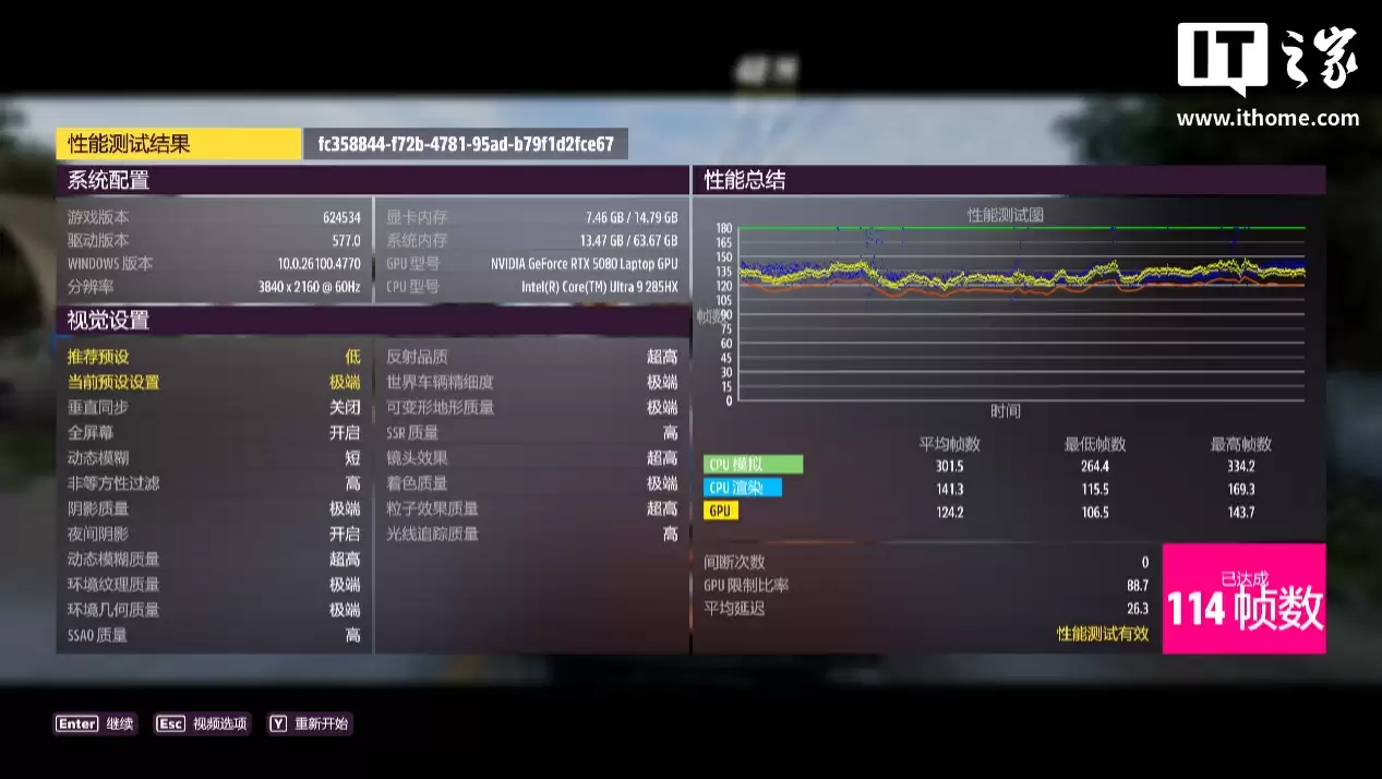 在 4K 极端画质下游戏平均帧数 114 帧,1% Low 帧 78 帧。
